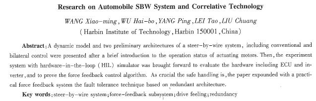 世界各大汽車廠商、研發(fā)機(jī)構(gòu),包括Daimlerysler、寶馬、zF、DELPHI、TRW以及日本KOYO精上技術(shù)研究所、日本國立大學(xué)、本田等都對SBW做了深入研究。澳大利亞昆土蘭大學(xué)、美國斯坦福大學(xué)分別研究了線控轉(zhuǎn)向的硬件在線試驗(yàn)、主動(dòng)轉(zhuǎn)向控制策略。SKF的汽車分部推出了稱為Novanta的新型線控汽車,已經(jīng)批量生產(chǎn)。國外已有幾十一項(xiàng)線控轉(zhuǎn)向?qū)@纾?/DIV>