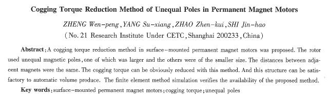 摘要:提出了一種適合于表貼式永磁電動(dòng)機(jī)的齒槽轉(zhuǎn)矩削弱方法,轉(zhuǎn)子磁極采用不對(duì)稱的火小極結(jié)構(gòu),一個(gè)碰極的寬度和其他磁極不同,其余磁極完全相同,各相鄰磁極之間的間隙相等,可以顯著降低電機(jī)齒槽轉(zhuǎn)矩,滿足自動(dòng)化、大批量生產(chǎn)的需要,有限元仿真結(jié)果驗(yàn)證了該方法的有效性。