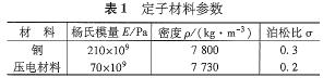 2所示,通過(guò)粘合操作將各部分連接成一個(gè)整體。從左往右依次是:彈性體,第一壓電片,彈性體,第二壓電片,彈性體,第三壓電片,底座。其中,定子基座的尺寸:外徑R=10 mm、內(nèi)徑r=6 mm、高度^:=15 mm;定子彈性體的尺寸:外徑R=10 mm、內(nèi)徑r=6 mm、高度^,=10 mm;壓電陶瓷的尺寸:外徑R=10 mm、r=內(nèi)徑6mm、高度h1=1 mm。定子材料如表1所示。