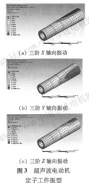 通過(guò)對(duì)圖2定子模型的有限元計(jì)算,得到該圓柱定子振動(dòng)的不同模態(tài),圖3為圓柱定子的三個(gè)工作振型。他們分別是三階置軸向振動(dòng)、三階y軸向振動(dòng)以及三階z軸向振動(dòng)。