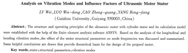 摘要:在研究圓柱定子超聲波電動(dòng)機(jī)結(jié)構(gòu)和工作原理的基礎(chǔ)上,運(yùn)用有限元分析軟件建立了超聲波電動(dòng)機(jī)定子的有限元計(jì)算模型,對(duì)縱向、彎曲振動(dòng)模態(tài)進(jìn)行了分析,研究了定子結(jié)構(gòu)參數(shù)對(duì)驅(qū)動(dòng)振子諧振頻率的影響,研究結(jié)論為回}主定子超聲波電動(dòng)機(jī)設(shè)計(jì)提供了相關(guān)理論依據(jù)。