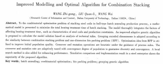 本文在分析退火工藝規(guī)則的基礎(chǔ)上,考慮影晌加熱時(shí)間的各方面因素,建立了以總加熱時(shí)間為目標(biāo)函數(shù)的裝爐組合數(shù)學(xué)模型。以工藝規(guī)則作為啟發(fā)式指導(dǎo),給出一種改進(jìn)的自適應(yīng)遺傳算法對(duì)模型尋優(yōu),結(jié)果較好。