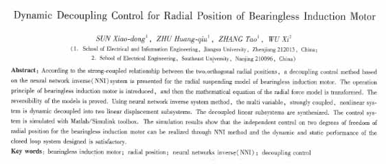 關(guān)鍵詞:無軸承異步電機(jī);徑向位置;神經(jīng)網(wǎng)絡(luò)逆;解耦控制