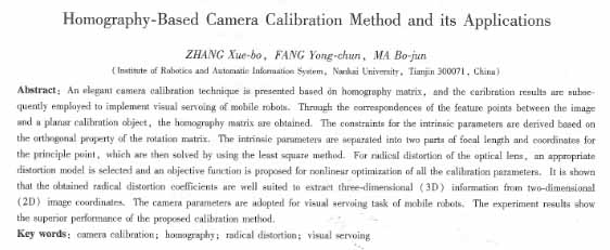 摘 要:提出了一種基于單厘矩陣的攝像機標定方法,并應用標定結果成功完成了移動機器人的視覺伺服任務。該方法首先根據(jù)圖像平面和標定板平面之間特征點的對應關系,對單應矩陣進行了估計,進而利用旋轉矩陣的單位正交性得到了其對攝像機內參數(shù)的約束條件:然后把攝像機內參數(shù)矩陣分解為有效焦距與主點位置兩部分,并利用最小二乘法分別對其進行求解。針對鏡頭的徑向畸變,恰當?shù)剡x取了一種畸變模型,并由此得到了一種新的目標函數(shù)來對攝像機的所有參數(shù)進行非線性優(yōu)化,從而使獲得的畸變系數(shù)更適合于從二維圖像信號中提取三雛位姿信息。最后將標定結果成功應用于移動機器人視覺伺服系統(tǒng)之中,實驗結果驗證了該標定算法具有簡單易用、精度較高等優(yōu)良性能。