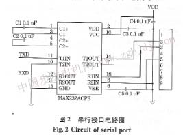 2)串行接口模塊本打印模塊主要通過擴展rs-232串口實現(xiàn)與帶有rs-232串口的打印機連接。打印模塊選用max3232芯片作為系統(tǒng)rs-232接口的收發(fā)器,工作電壓為3.o~5.5 v。該芯片功耗低、傳輸速率可達到l mbps,并采用18 pin的tssop封裝。max3232芯片的itl/cmos輸入輸出信號與arm的uart輸入/輸出口對接。每個uart包含一個波特率產生器、發(fā)送器、接收器和控制單元。波特率發(fā)生器以mclk作為時鐘源;發(fā)送器和接收器色含16字節(jié)的fifos和移位寄存器。要被發(fā)送的數據,首先被寫入fifo,然后拷貝到發(fā)送移位寄存器,接著從數據輸出端口依次移位輸出。系統(tǒng)的串口電路原理圖,如圖2所示。