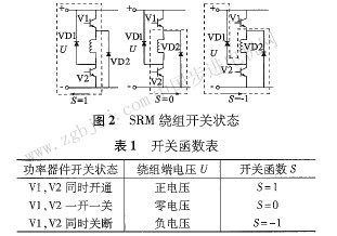 在傳統(tǒng)的不對(duì)稱(chēng)半橋的單極性功率變換器中[5],對(duì)于單一方向的繞組電流,根據(jù)不同的開(kāi)關(guān)狀態(tài),每相繞組有三種可能的電壓狀態(tài),如圖2所示。相應(yīng)開(kāi)關(guān)函數(shù)si(i=1,2,3,4)的定義如表1所示。