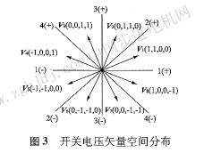 由表1可知,四相sRM功率變換器的開(kāi)關(guān)模式共有3×3×3×3=81種組合。為簡(jiǎn)化方便,選用其中8個(gè)幅值相等、空間互差45。的開(kāi)關(guān)電壓矢量,如圖3所示。電壓矢量沒(méi)有使用零矢量,零矢量主要用于故障保護(hù)和停a機(jī)操作。