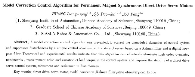摘要:針對(duì)直驅(qū)電動(dòng)機(jī)的特點(diǎn),提出了模型校正控制策略,利用基于卡爾曼濾波器的狀態(tài)觀測(cè)器和數(shù)字低遙濾波器的結(jié)構(gòu)組合對(duì)控制系統(tǒng)模型進(jìn)行校正,同時(shí)對(duì)觀測(cè)的負(fù)載轉(zhuǎn)矩進(jìn)行補(bǔ)償。理論和實(shí)驗(yàn)均表明該策略能夠有效消除控制系統(tǒng)中的高階成分、非線(xiàn)性因素、高頻噪聲及負(fù)載轉(zhuǎn)矩變化的影響,提高直驅(qū)伺服系統(tǒng)的穩(wěn)定性、魯棒性和抗干擾能力。