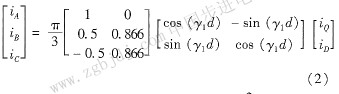式中:K為推力常數(shù),與永磁體磁化強(qiáng)度、永磁陣列結(jié)構(gòu)、繞組結(jié)構(gòu)、電機(jī)極對數(shù)、氣隙高度等有關(guān);iD、iQ為直線電動機(jī)的直軸、交軸電流。iQ、iD到三相電流iA、iB、iC的坐標(biāo)變換方程: