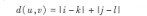 2)基于距離的kleinberg網(wǎng)絡(luò)模型 kleinberg模型中的^ⅳ個(gè)節(jié)點(diǎn)分布在一個(gè)二維網(wǎng)格上。網(wǎng)格申2個(gè)節(jié)點(diǎn)u和v之間的網(wǎng)格距離d定義為兩節(jié)點(diǎn)之間的網(wǎng)格步數(shù)。設(shè)坐標(biāo)為(i,j),v的坐標(biāo)為(k,l),則有: