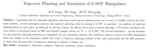 摘 要:針對(duì)六自由度鏈?zhǔn)綑C(jī)械臂在進(jìn)行正運(yùn)動(dòng)學(xué)、逆運(yùn)動(dòng)學(xué)以及軌跡規(guī)劃仿真時(shí),不易直觀地驗(yàn)證運(yùn)動(dòng)學(xué)算法的正確性和軌跡規(guī)劃的效果,在正確建立機(jī)械臂數(shù)學(xué)模型的基礎(chǔ)上,重點(diǎn)分析了機(jī)械臂在關(guān)節(jié)空間中軌跡規(guī)劃的兩種實(shí)現(xiàn)方法,并采用三雛運(yùn)動(dòng)仿真進(jìn)行了驗(yàn)證。開發(fā)了一套六自由度機(jī)械臂三雛仿真軟件,該仿真軟件在vc++6 0開發(fā)平臺(tái)上,首先利用分割類將基于nifc框架的窗口分割成為控制霄口和視圖窗口兩部分,然后利用openci的圖形厙對(duì)機(jī)械臂進(jìn)行建模,首次將正運(yùn)動(dòng)學(xué)、逆運(yùn)動(dòng)學(xué)以及軌跡規(guī)劃算法融入其中開發(fā)而成一該仿真軟件有效地驗(yàn)證了機(jī)械臂運(yùn)動(dòng)學(xué)模型建立的正確性,同時(shí)也對(duì)三次多項(xiàng)式和五次多項(xiàng)式兩種軌跡規(guī)劃方法做了直觀的比較,結(jié)果表明后一種軌跡規(guī)劃效果明顯優(yōu)于前一種。