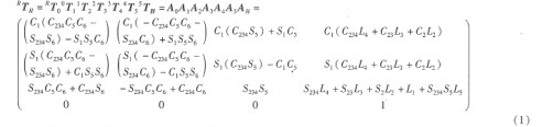 式中,a0為基座坐標(biāo)系到坐標(biāo)系0(關(guān)節(jié)一)之間的變換矩陣;a1為坐標(biāo)系0到坐標(biāo)系1之間的變換矩陣;ah為坐標(biāo)系5到坐標(biāo)系日之間的變換矩陣;s12= sin(θ1+θ2);cl2=cos(θ1+θ2);s123=sin(θ1+θ2+θ3)。