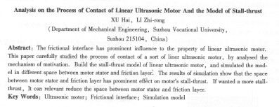 | 直線駐波型超聲電機(jī)的接觸分析和堵轉(zhuǎn)推力模型 許海,李志榮 (蘇州市職業(yè)大學(xué)機(jī)電工程系,蘇州215104)     摘  要:摩擦界面對超聲電機(jī)的性能有至關(guān)重要的影響。文章針對一種基于面內(nèi)振動的直線駐波超聲電機(jī),結(jié)合電機(jī)的工作振型,對電機(jī)的定、轉(zhuǎn)子的接觸過程進(jìn)行了詳盡的論述,建立了堵轉(zhuǎn)情況下的****輸出力模型;并進(jìn)行了仿真研究。通過仿真可以得出超聲電機(jī)的堵轉(zhuǎn)推力受定、轉(zhuǎn)裝配間隙的影響****。在電機(jī)已完成制造的情況下。如要得到較大的堵轉(zhuǎn)推力,可適當(dāng)調(diào)整定轉(zhuǎn)子的裝配間隙。 關(guān)鍵詞:超聲電機(jī);摩擦界面;仿真模型 中國分類號:tm359.9    文獻(xiàn)標(biāo)志碼:a    文章編號:1001-6848( 2010)05-0019-03 o引  言     依據(jù)驅(qū)動原理不同,超聲電機(jī)可分為行波型和駐波行兩大類。就目前來看,有關(guān)超聲電機(jī)負(fù)載特性及摩擦界面的文獻(xiàn)報(bào)道主要是關(guān)于行波型旋轉(zhuǎn)超聲電機(jī)。直線駐波型超聲電機(jī)是一種較新的產(chǎn)品,本文針對一種基于面內(nèi)振動的直線駐波型超聲電機(jī)的接觸過程進(jìn)行了細(xì)致的研究,并建立了該型電機(jī)的堵轉(zhuǎn)推力模型。 1  直線駐波型超聲電機(jī)的定轉(zhuǎn)子驅(qū)動原理   本文所設(shè)計(jì)的電機(jī)是基于面內(nèi)振動,通過合理的結(jié)構(gòu)設(shè)計(jì)使電機(jī)定子產(chǎn)生同頻的一階縱振和二階彎振,在電機(jī)定子上表面(驅(qū)動面)上合成相應(yīng)的橢圓運(yùn)動,通過定轉(zhuǎn)子之間的接觸界面利用摩擦作用,以摩擦力的形式對外輸出。一般在定、轉(zhuǎn)子間施加一定的預(yù)壓力,再利用二者接觸 設(shè)縱振振幅為a;彎振振幅為b,則縱振振型函數(shù)和彎振振型函數(shù)如下: 縱向伸縮振動位移函數(shù)為: 橫向彎曲振動位移函數(shù)為: 從式(2),式(3)中消去時間參數(shù)可得: 可以看出,當(dāng)β-α=π/2時,式(5)變?yōu)橐粰E圓: 即當(dāng)縱振和彎振的相位差為90度時,驅(qū)動面上每一點(diǎn)的運(yùn)動軌跡為一橢圓。這時縱向伸縮振動位移函數(shù)和橫向彎曲振動位移函數(shù)變?yōu)椋?/div>