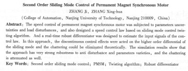 | 永磁同步電機(jī)二階滑?刂 張冀,張興華 (南京工業(yè)大學(xué)自動(dòng)化學(xué)院,南京210009)     摘要:針對(duì)受參數(shù)不確定性和負(fù)載擾動(dòng)影響的永磁同步電機(jī)速度控制問(wèn)題,采用二階滑?刂频穆菪惴▉(lái)設(shè)計(jì)速度控制器,并利用實(shí)時(shí)魯棒微分器來(lái)估算控制器所需要的轉(zhuǎn)速微分信號(hào)。這種二階滑?刂品椒▽⒉贿B續(xù)控制作用滑模量的高階微分上,理論上可以消除抖振。仿真和實(shí)驗(yàn)結(jié)果表明,該方法對(duì)于負(fù)載擾動(dòng)和參數(shù)的變化具有較強(qiáng)的魯棒性,同時(shí)也有效地削弱了抖振現(xiàn)象。 關(guān)鍵詞:二階滑?刂疲挥来磐诫姍C(jī);螺旋算法;魯棒微分器 中圖分類號(hào):tm351; tm341    文獻(xiàn)標(biāo)志碼:a    文章編號(hào):1001-6848(2010)05-0062-04 0引  言     永磁同步電機(jī)是一個(gè)多變量非線性對(duì)象,其轉(zhuǎn)與定子電流之間有很強(qiáng)的耦合,加上定子電阻化和負(fù)載擾動(dòng)等因素的影響,所以很難對(duì)其進(jìn)高性能的控制。經(jīng)典pid控制雖得到了廣泛應(yīng)用但魯棒性較差;現(xiàn)代的神經(jīng)網(wǎng)絡(luò)、模型參考自應(yīng)控制又因?yàn)樗惴◤?fù)雜,大多處在理論研究階段在實(shí)際工程中應(yīng)用較少;W兘Y(jié)構(gòu)控制具有魯棒性強(qiáng)、實(shí)現(xiàn)簡(jiǎn)單的優(yōu)點(diǎn),在電機(jī)參數(shù)變化及出現(xiàn)擾動(dòng)時(shí),仍然保證滿意的性能,因而受到越來(lái)越多的國(guó)內(nèi)外學(xué)者的重視。但是由于其控制作的不連續(xù)性,很容易使系統(tǒng)產(chǎn)生抖振,大大影響了實(shí)際控制中的應(yīng)用。為了削弱抖振,通常采用飽和函數(shù)來(lái)代替控制中不連續(xù)的符號(hào)函數(shù),但這種方法會(huì)降低系統(tǒng)的精度和魯棒性。許多學(xué)者從不同角度提出了削弱抖振的方法,如降低切換增益方法、邊界層法、濾波方法等。這些方法都有各自的局限性,如算法比較復(fù)雜,對(duì)系統(tǒng)模型和參數(shù)依賴較大等。   本文采用二階滑?刂频穆菪惴▉(lái)設(shè)計(jì)控制器,用轉(zhuǎn)速參考值、轉(zhuǎn)速估計(jì)值和它們的一階導(dǎo)數(shù)作為控制器的輸入,其中轉(zhuǎn)速的估計(jì)值由魯棒微分器給出,它具有有限時(shí)間收斂及魯棒性較強(qiáng)的特點(diǎn)。通過(guò)仿真和實(shí)驗(yàn)驗(yàn)證了提出的控制策略的有效性和可行性。 1永磁同步電機(jī)的數(shù)學(xué)模型   永磁同步電機(jī)在面坐標(biāo)軸下的動(dòng)態(tài)方程為 式中,ud、uq、id、iq、ld、lq。分別為定子dq軸電壓、電流和電感。r為定子電阻,m為轉(zhuǎn)子轉(zhuǎn)速,j為轉(zhuǎn)動(dòng)慣量,b為摩擦因數(shù),te為電磁轉(zhuǎn)矩,tl為負(fù)載轉(zhuǎn)矩,ψ為永磁體磁鏈,p為極對(duì)數(shù)。若采用id=0的控制方式,則式(1)可以化簡(jiǎn)為: 2永磁同步電機(jī)的二階滑模控制 2.1二階滑模     不失一般性,考慮單輸入非線性系統(tǒng) 其中,x∈x∈r為狀態(tài)變量,u∈r為控制量,σ為輸出函數(shù),稱為滑模變量。f、g是光滑的不確定函數(shù)。若系統(tǒng)(3)的相關(guān)度為2,則對(duì)σ進(jìn)行連續(xù)求導(dǎo)有: 其中h、g為光滑的不確定函數(shù)。假設(shè)存在kn、km、c使得輸入輸出的限定條件: 成立。則令局部坐標(biāo),可以將二階滑?刂茊(wèn)題等效成有限時(shí)間穩(wěn)定問(wèn)題:     由以上討論給出以下定義:  定義1:已知滑模變量σ(t,x),其二階滑模流形 定義為: 定義2:考慮非空的二階滑模集合式(7),并假設(shè)它是filippov意義下的局部可積集合,即它由不連續(xù)動(dòng)態(tài)系統(tǒng)的filippov軌跡組成。滿足式(7)的系統(tǒng)(3)的相應(yīng)的行為被稱為滑模變量一σ(t,z)的二階滑模。 2.2滑?刂破髟O(shè)計(jì) |