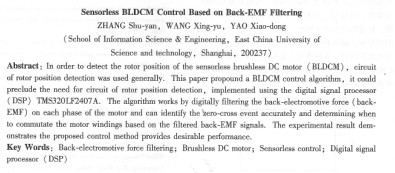 | 基于反電勢(shì)濾波方法的無(wú)傳感器bldcm控制 張淑艷,王行愚,姚曉東 (華東理工大學(xué)信息科學(xué)與工程學(xué)院,上海200237)     摘要:目前應(yīng)用于無(wú)傳感器bldcm的控制方法都是采用位置檢測(cè)電路末間接獲得轉(zhuǎn)子位置信息,實(shí)現(xiàn)對(duì)bldcm的控制。該文提出一種可以省掉位置檢測(cè)電路的基于反電勢(shì)濾波的方法,可以準(zhǔn)確獲得反電勢(shì)過(guò)零點(diǎn),驅(qū)動(dòng)bldcm平穩(wěn)運(yùn)行;趖ms320lf2407a的控制平臺(tái)進(jìn)行實(shí)驗(yàn),結(jié)果證明了該方法的有效性。 關(guān)鍵詞:反電動(dòng)勢(shì)濾波;無(wú)刷直流電機(jī);無(wú)傳感器控制;數(shù)字信號(hào)處理器( dsp) 中圖分類號(hào):tm36 +1    文獻(xiàn)標(biāo)志碼:a    文章編號(hào):1001-6848( 2010)05-0066-04 0引言     目前,應(yīng)用于無(wú)傳感器bldcm控制的方法很多,如反電勢(shì)檢測(cè)法、定子繞組電感法、速度無(wú)關(guān)位置函數(shù)法、基于擴(kuò)展卡爾曼濾波器(ekf)的狀態(tài)觀測(cè)器法、智能化控制方法(模糊控制、神經(jīng)網(wǎng)絡(luò)控制以及小波神經(jīng)網(wǎng)絡(luò)控制等)等等.,這些方法都是以位置檢測(cè)電路為基礎(chǔ)的,不僅增加了電路的復(fù)雜性和成本,也增大了控制板的體積,因此本文提出不需要位置檢測(cè)電路的基于反電勢(shì)濾波的方法,只需要幾個(gè)電阻將反電勢(shì)信號(hào)限制在tms320lf2407a芯片的ad采樣模塊的工作電壓范圍內(nèi)。該方法電路實(shí)現(xiàn)簡(jiǎn)單可靠,而且能夠獲得準(zhǔn)確的反電勢(shì)過(guò)零點(diǎn),可以代替?zhèn)鹘y(tǒng)的位置檢測(cè)電路獲取轉(zhuǎn)子位置信息。     由于反電勢(shì)信號(hào)與電機(jī)轉(zhuǎn)速咸正比,在低速和靜止情況下,反電勢(shì)信號(hào)很小或者沒(méi)有,在這種情況下找到過(guò)零點(diǎn)是非常困難的,而在高速區(qū)域反電勢(shì)信號(hào)幅值較大,尋找過(guò)零點(diǎn)相對(duì)容易,但是隨著轉(zhuǎn)速的提高,相位延遲也會(huì)越來(lái)越大,因此給換相時(shí)刻的確定帶來(lái)困難[46],本文將詳細(xì)討論以上兩個(gè)問(wèn)題,并給出基于反電勢(shì)濾波方法的無(wú)傳感器bldcm控制實(shí)驗(yàn)結(jié)果。 1反電勢(shì)濾波控制方法概述   反電勢(shì)檢測(cè)控制法的基本原理是在忽略永磁無(wú)刷直流電動(dòng)機(jī)電樞反應(yīng)影響的前提下,通過(guò)檢測(cè)“斷開(kāi)相”的反電勢(shì)過(guò)零點(diǎn),按照一定規(guī)則作適當(dāng)延遲后得到功率器件正確觸發(fā)時(shí)刻,再按照電機(jī)的運(yùn)轉(zhuǎn)方向以一定次序來(lái)輪流觸發(fā)六個(gè)功率管,即可實(shí)現(xiàn)對(duì)無(wú)傳感器bldcm的控制。由此可見(jiàn),如何給出一個(gè)可精確識(shí)別過(guò)零點(diǎn)的算法,從而估計(jì)轉(zhuǎn)子位置,使電機(jī)繞組在正確的時(shí)間進(jìn)行換相是實(shí)現(xiàn)bldcm控制的關(guān)鍵。 以往的反電勢(shì)過(guò)零點(diǎn)檢測(cè)都是通過(guò)位置檢測(cè)電路來(lái)實(shí)現(xiàn)的,一般由隔離、濾波和比較三個(gè)環(huán)節(jié)構(gòu)成,位置檢測(cè)電路得到的反電勢(shì)信號(hào)送人dsp的捕獲引腳,根據(jù)一定的規(guī)則產(chǎn)生換向信號(hào),控制功率管的導(dǎo)通與關(guān)斷,驅(qū)動(dòng)電機(jī)運(yùn)行。   在實(shí)際情況下,在斷開(kāi)區(qū)間段反電勢(shì)存在以下噪聲:一是耦合來(lái)自導(dǎo)通區(qū)間段的噪聲,二是繞組的pwm驅(qū)動(dòng)信號(hào)耦合到繞組的bemf信號(hào)上。這些噪聲會(huì)使位置檢測(cè)信號(hào)出錯(cuò),導(dǎo)致電機(jī)無(wú)法正常運(yùn)轉(zhuǎn)。因此,需要尋找一種有效的方法來(lái)獲取可靠的反電勢(shì)過(guò)零點(diǎn)。   本文提出的基于反電勢(shì)濾波的過(guò)零點(diǎn)檢測(cè)方法,省掉了位置檢測(cè)電路,直接將分壓后的反電勢(shì)信號(hào)送人dsp芯片adc端口,然后對(duì)反電勢(shì)信號(hào)進(jìn)行采樣,隨后通過(guò)軟件濾波的方法對(duì)反電勢(shì)信號(hào)進(jìn)行處理,獲取準(zhǔn)確的反電勢(shì)過(guò)零點(diǎn),再對(duì)其進(jìn)行適當(dāng)?shù)臑V波延遲補(bǔ)償,最終得到正確的換向時(shí)刻,實(shí)現(xiàn)無(wú)傳感器bldcm的控制;赿spfms320lf2407a平臺(tái)的反電勢(shì)濾波方法的無(wú)傳感器bldcm控制系統(tǒng)的原理框圖如圖1所示。     電機(jī)低速和高速時(shí)反電勢(shì)的特征差別較大,因此反電勢(shì)濾波控制方法不同,下面具體介紹低速區(qū)間反電勢(shì)濾波控制方法和高速區(qū)間的反電勢(shì)濾波控制方法。 2低速區(qū)間的反電勢(shì)濾波控制方法     由于低速區(qū)間的反電勢(shì)幅值較小,因此某一相斷開(kāi)區(qū)間的反電勢(shì)信號(hào)的斜率也比較小,再加上各種噪聲對(duì)它的影響,使得在斷開(kāi)區(qū)間檢測(cè)到虛假過(guò)零點(diǎn)信號(hào)的概率較大。     針對(duì)這種情況,本文采取的方法是:對(duì)u(a)、v(b)、w(c)三相同時(shí)進(jìn)行連續(xù)采樣,獲得這三個(gè)采樣結(jié)果之后,將會(huì)產(chǎn)生一個(gè)adc中斷,然后這些采樣被送至三個(gè)相同的iir濾波器,產(chǎn)生三個(gè)濾波采樣,將該采樣值與過(guò)零閾值進(jìn)行比較來(lái)確定過(guò)