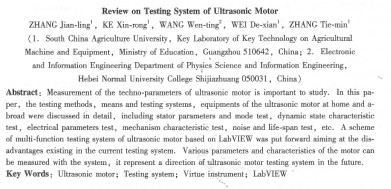 | 超聲電機(jī)測試研究綜述 張建瓴1,可欣榮1,王文婷2,魏德仙1,張鐵民1     (1.華南農(nóng)業(yè)大學(xué)南方農(nóng)業(yè)機(jī)械與裝備關(guān)鍵技術(shù)省部共建教育部重點(diǎn)實(shí)驗(yàn)室,廣州510642;2.河北師范大學(xué)物理科學(xué)與信息工程學(xué)院電子信息工程系,石家莊050031)     摘要:超聲電機(jī)技術(shù)參數(shù)的測量對其研究有重要意義,但由于超聲電機(jī)的測試參數(shù)和測試項(xiàng)目較多,目前國內(nèi)外出現(xiàn)的測試手段、方法及測試系統(tǒng)也就五花八門,概括起來,這些測試主要集中在定子參數(shù)及模態(tài)測試、瞬態(tài)特性測試、電參量測試、機(jī)械特性測試、噪音和壽命測試等方面。文章對目前國內(nèi)外超聲電機(jī)測試研究進(jìn)行了綜述,并針對現(xiàn)有測試系統(tǒng)存在的弊端,提出了一種基于虛擬儀器的超聲電機(jī)測試系統(tǒng)方案,該系統(tǒng)可方便完成多種參數(shù)和特性的測量,將是未來超聲電機(jī)測試系統(tǒng)發(fā)展的一個(gè)方向。 關(guān)鍵詞:超聲電機(jī);測試系統(tǒng);虛擬儀器;labview 中圖分類號:tm359. 9    文獻(xiàn)標(biāo)志碼:a    文章編號:1001-6848(2010)05-0080-06 0引  言     在超聲電機(jī)研究中性能參數(shù)的測試與試驗(yàn)研究具有重要的意義,國內(nèi)外的研究者也都非常重視超聲電機(jī)的試驗(yàn)與測試工作,事實(shí)上許多研究文獻(xiàn)都附有試驗(yàn)及測試數(shù)據(jù)。但由于超聲電機(jī)的測試項(xiàng)目較多,對測試系統(tǒng)的要求也較高,因此,目前對超聲電機(jī)許多重要參數(shù)指標(biāo)還沒有進(jìn)行綜合測試和評價(jià)的通用測試裝置,為了能對已有的超聲電機(jī)技術(shù)參數(shù)做出檢測,定性并定量出超聲電機(jī)的性能好壞,各超聲電機(jī)研究單位大都是自己研發(fā)具有特定作用的測試系統(tǒng),這些測試系統(tǒng)多存在功能單一,開發(fā)周期長,投資大等缺點(diǎn)。因此,研究簡單實(shí)用多功能的超聲電機(jī)測試系統(tǒng)是未來超聲電機(jī)發(fā)展的一個(gè)迫切要求。本文對目前國內(nèi)外的超聲電機(jī)測試研究進(jìn)行了綜述。 1超聲電機(jī)測試研究現(xiàn)狀 1.1定子參數(shù)及模態(tài)測試   超聲電機(jī)定子參數(shù)及模態(tài)測試主要是對定子的參數(shù)和動(dòng)態(tài)特性,如定子的導(dǎo)納、阻抗、共振頻率及振型等的測試。因?yàn)樵诔曤姍C(jī)中要激發(fā)起定子彈性體的高頻微幅共振,并通過摩擦作用將這種微米級振動(dòng)轉(zhuǎn)換為宏觀的轉(zhuǎn)動(dòng)或直線運(yùn)動(dòng)。因此,定子彈性體的動(dòng)態(tài)特性(共振頻率、振型振幅)等對超聲電機(jī)的研究來說就十分重要,特別是對超聲電機(jī)定子結(jié)構(gòu)的優(yōu)化設(shè)計(jì),壓電陶瓷分區(qū)極化的****配置及超聲電機(jī)效率的改善等研究有很大的幫助[2-3]。     在國外,takashi maeno等人使用激光多普勒儀對一類環(huán)形超聲電機(jī)的定、轉(zhuǎn)子接觸區(qū)域內(nèi)的動(dòng)態(tài)切向、法向位移和速度進(jìn)行了測量。nish-ikura y等人利用頻閃相移干涉儀測量了超聲電機(jī)啟動(dòng)時(shí)定子的瞬態(tài)振動(dòng),該干涉儀由一個(gè)多狀態(tài)的半導(dǎo)體激光二極管和一個(gè)光頻隔離器實(shí)現(xiàn),對測量超聲電機(jī)的瞬態(tài)振動(dòng)有一定幫助。文獻(xiàn)[7]利用激光振動(dòng)儀構(gòu)造了一個(gè)測試裝置,可以對定子的振動(dòng)特性做出測試。tsukimoto t等人則使光電位移法對超聲電機(jī)的定、轉(zhuǎn)子接觸特性進(jìn)行了測量。takefumi 等人利用多普勒激光振動(dòng)計(jì)測出了一種微型超聲電機(jī)定子的振動(dòng)速度,得到了振動(dòng)速度和頻率、振動(dòng)速度和輸入電壓的關(guān)系曲線。并通過電機(jī)拖動(dòng)負(fù)載測得了這種微型超聲電機(jī)的靜態(tài)扭矩,同時(shí)還開發(fā)了一種用來測試轉(zhuǎn)速和預(yù)緊力關(guān)系的實(shí)驗(yàn)裝置,該裝置利用一個(gè)激光計(jì)數(shù)器測出r超聲電機(jī)的轉(zhuǎn)速,并通過測量表征預(yù)緊力變化的彈簧長度的變化,得到了超聲電機(jī)轉(zhuǎn)速和預(yù)緊力的關(guān)系。     在國內(nèi),賈書海等人構(gòu)建了一個(gè)數(shù)字散斑振動(dòng)測量系統(tǒng),對一種圓柱形超聲電機(jī)定子的振動(dòng)模態(tài)進(jìn)行了測量,得到了定子的振動(dòng)形態(tài)和振幅。同樣使用激光散斑干涉技術(shù)對超聲電機(jī)定子振型進(jìn)行測量的還有文獻(xiàn)[3,11 ,12]等。顧菊平等使用bt -4低頻頻率特性測試儀對所開發(fā)超聲電機(jī)定子進(jìn)行了阻抗特性測試,并使用電子散斑測振方法對定子的振型進(jìn)行了測量。該文還使用高頻功率表cp320、手持式光電轉(zhuǎn)速表等對所研制的超聲電機(jī)的輸出特性進(jìn)行了測量,得到了速度一轉(zhuǎn)矩、效率一轉(zhuǎn)矩等關(guān)系曲線。     由于超聲電機(jī)定子的諧振頻率在20 khz以上,因此使用高頻掃描激光測振儀器對定子振型進(jìn)行測量就是一種較好的方法。趙淳生等人利用polytec公司psv 300f-b型高頻掃描激光測振系統(tǒng),測出了定子的位移振幅、速度振幅和加速度振幅,并得到了定子的位移、速度和加速度的頻率響應(yīng)曲