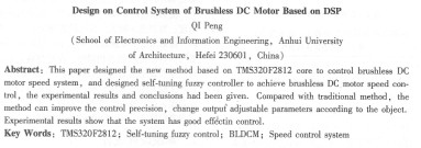 | 基于dsp的無刷直流電動機控制系統(tǒng)設(shè)計 戚鵬 (安徽建筑工業(yè)學(xué)院電子與信息工程學(xué)院,安徽230601)     摘要:提出并設(shè)計了以tms320f2812為核心的無刷直流電動機調(diào)速系統(tǒng)設(shè)計與實現(xiàn)方案,并設(shè)計了自整定模糊控制器實現(xiàn)無刷直流電機的調(diào)速,給出了實驗結(jié)果和結(jié)論。該方法較之傳統(tǒng)的調(diào)速控制方法,可以提高控制精度,又能夠根據(jù)對象輸出的變化調(diào)整參數(shù)。實驗結(jié)果表明,該系統(tǒng)具有優(yōu)良的控制效果。 關(guān)鍵詞:tms320f2812;自整定模糊控制;無刷直流電動機;調(diào)速系統(tǒng) 中圖分類號:tm36 +1    文獻標志碼:a    文章編號:1001-6848(2010)05-0103-03 0引  言     無利直流電機不僅具有交流電機的體積小、重量輕、慣量小等特點,而且擁有直流電動機優(yōu)良的調(diào)速性能,但又沒有機械換向器的缺點,因此主要應(yīng)用于工廠自化和辦公自動化方兩,它正在迅速取代傳統(tǒng)的直流電機和異步電機,在高精度的數(shù)控設(shè)備如機器人和機械手的驅(qū)動中,無刷直流電機的應(yīng)用也相當多。因此無刷直流電機的控制問題成為研究的重點。     電機調(diào)速系統(tǒng)最常用的方法是雙閉環(huán)pid控制器,但該方法存在參數(shù)不能隨著被控對象的變化而作相應(yīng)的調(diào)速的缺點,將模糊控制和pid控制集合起來引入調(diào)速系統(tǒng)可以把一些具有模糊性的成熟經(jīng)驗和規(guī)則有機的融入到控制策略中,具有較強的魯棒性。但采取模糊控制仍然存在一事實上的超調(diào)現(xiàn)象,對系統(tǒng)中的不確定因素控制不是很好,穩(wěn)態(tài)精度仍然可以提高。本文提出了一種以tms320f2812為核心的無刷直流電動機調(diào)速系統(tǒng)設(shè)計與實現(xiàn)的方案,并沒計了自整定模糊控制器實現(xiàn)無刷直流電機調(diào)速,給出了實驗結(jié)果和結(jié)論。 1.自整定模糊控制技術(shù)     常規(guī)模糊控制器具有響應(yīng)時間短,超調(diào)量小,魯棒性好,適于非線性時變的復(fù)雜系統(tǒng),建立模型相對容易等優(yōu)點,但同時也還存在一些問題:首先,常規(guī)的模糊控制器的控制規(guī)則建立之后就固定不變,難以獲得****控制指標。相對于電動機起動過程這類復(fù)雜的被控對象,采用這種控制器不能獲得預(yù)期的控制效果,而且適應(yīng)系統(tǒng)和環(huán)境變化的能力差。   在本文中采用參數(shù)自整定模糊控技術(shù),根據(jù)起動運行過程中的實際偏差和偏差變化率的大小,控制器選取不同的比例因子。這種基于量化、比例因子自調(diào)整方法算法簡單高效,控制效果較好。結(jié)構(gòu)框圖如圖1所示。   模糊控制器采用二維模糊控制,主模糊控制單元和模糊參數(shù)尋優(yōu)控制單元都以無刷電動機的輸出電流與期望值的偏差e及偏差變化率ec作為輸入變量。模糊參數(shù)尋優(yōu)控制單元的輸出可調(diào)整因子k1、k2、k3分別表示量化因子ke、kec以及比例因子ka的調(diào)整系統(tǒng)值。e、ec以及模擬控制器的輸出。的論域取{ -4,-3,-2,-1,0.+1.+2,+3,+4}。分為7個模糊子集,k1模糊語言變量選擇7個:nb,nm,ns,zo,ps,pm,pb;解模糊使用重心法。如表1—表4所示     當e和氣較大時,縮小k1和k2,降低對大偏差的分辨率,減少偏差,縮短過渡過程時間。當e和ec較小時,系統(tǒng)已接近穩(wěn)態(tài),這時應(yīng)增大k1和k2,提高系統(tǒng)對小偏差的分辨率,提高控制的靈敏度;當誤差e較大,且與誤差變化ec符號相反時,應(yīng)適當增大控制器的大小。當誤差e較大,且與誤差變化ec符號相同時,應(yīng)適當減小k3系統(tǒng)響應(yīng)在沒定值附近時(此時誤差e較。,為防止產(chǎn)生較大的超調(diào)或欠調(diào),k3應(yīng)該具有較寬的變化范圍,適當減小比例因子以減小超調(diào)。按照上述自整定原則,可以獲得較好的控制效果。 2系統(tǒng)硬件設(shè)計     tms320f2812是32位的控制專用、內(nèi)含閃存以及高達150 mips的數(shù)字信號處理器,專閂為工業(yè)自動化及自動化控制等應(yīng)用而設(shè)計。系統(tǒng)結(jié)構(gòu)框圖如圖2所示。   系統(tǒng)工作原理:交流電由整流橋轉(zhuǎn)換為直流電,一部分經(jīng)過穩(wěn)壓模塊后作為dsp芯片和其他主控板上電子器件的供電電源,一部分作為   |