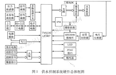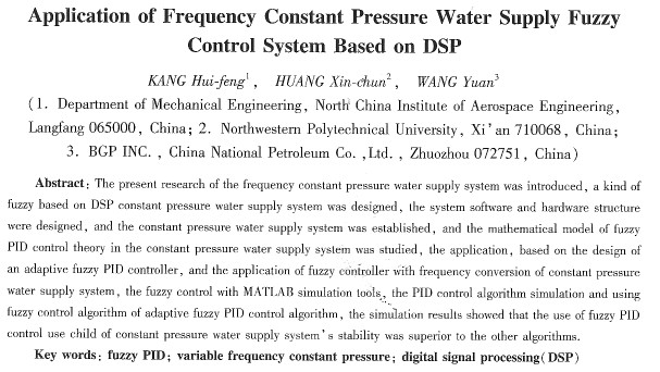 | 基于DSP的變頻恒壓供水模糊控制系統(tǒng)應(yīng)用     康會峰1,黃新春2,王元3     (1北華航天工業(yè)學(xué)院機(jī)械工程系,河北廊坊065000;2西北I業(yè)大學(xué), 陜西西安71 0068;3中石油集團(tuán)東方地球物理勘探有限責(zé)任公司,河北涿州072751)      摘要:分析了變頻恒壓供水系統(tǒng)的研究現(xiàn)狀,設(shè)計了一種了數(shù)字信號處理器(DSP)的模糊厘壓供水系統(tǒng),介紹了該系統(tǒng)的軟、硬件結(jié)構(gòu),建立了恒壓供水系統(tǒng)的數(shù)學(xué)模型,研究了模糊PID控制理論在恒壓供水系統(tǒng)巾的應(yīng)用。在此基礎(chǔ)漫計了一種目適應(yīng)模糊PID控制器,將該模糊控制器應(yīng)用于變頻恒壓供水的模糊控制系統(tǒng),并用MATAB仿真T具仿真了 PID控制算法,模糊控制算法及提出的自適應(yīng)模糊PID控制算法,仿真結(jié)果表明使用自適應(yīng)模糊PID控制的恒壓供水系統(tǒng)的穩(wěn)定性較其他兩種算法優(yōu)越。     關(guān)鍵詞:模糊PID;變頻恒壓;數(shù)字信號處理器 中圖分類號:TM 921 51文獻(xiàn)標(biāo)志碼:A文章編號:1673-6540(2010)05-0016-05 0 引言       變頻調(diào)速是一項有效的節(jié)能降耗技術(shù),其節(jié)電率高,能將因設(shè)計冗余和用量變化而浪費的大部分電能都節(jié)省F來,具有調(diào)速精度高,功率岡數(shù)高等特點[9].國外學(xué)者如:美國的K.E Lansey,RobertDemoyer Jr,L E Ormsbee,英國的FI.SPowet/,B.Coulbeck,P Jowitt,日本的KazumasaMuguruma,M.Tuskiyama及以色列的U Shamir,c D D fioward等人也在供水系統(tǒng)建模理論上進(jìn)行了許多有益的探討,為變頻恒壓供水系統(tǒng)的性能優(yōu)化提供了理論依據(jù)[1-3]。國內(nèi)有不少公司在做變頻恒壓供水的工程,其人多采用國外的變頻器控制水泵的轉(zhuǎn)速[4]。水管管網(wǎng)壓力的閉環(huán)調(diào)節(jié)及多臺水泵的循環(huán)控制,有的采用可編程邏輯控制器(PLC)予以實現(xiàn),有的采用單片機(jī)及相應(yīng)的軟件予以實現(xiàn)。根據(jù)國內(nèi)、外在恒壓供水方面的研究進(jìn)展,術(shù)文提出了一種基于數(shù)字信號處理器(DsP)的模糊恒壓供水系統(tǒng),設(shè)計了自適應(yīng)模糊控制器。應(yīng)用simulink仿真軟件對比了自適應(yīng)模糊控制器與PID控制器及模糊控制器的優(yōu)異特點。 l  恒壓供水系統(tǒng)硬件電路設(shè)計 1.1  系統(tǒng)硬件結(jié)構(gòu)設(shè)計     以TMS320LF2407A芯片為核心,外圍擴(kuò)展了其他的功能模塊,實現(xiàn)了以下功能:壓力信號檢測、水泵電流信號檢測、工頻電壓與變頻器輸出電壓的頻率和相位的檢測、D/A轉(zhuǎn)換、繼電器控制、通信、鍵盤輸入、液晶顯示、擴(kuò)展接口及故障報警。系統(tǒng)硬件總體框圖如圖1所示。 1.2系統(tǒng)工作原理     在該恒壓供水系統(tǒng)中,首先由置于水體內(nèi)的 2  系統(tǒng)軟件設(shè)計 2.1  系統(tǒng)主流程圖設(shè)計     該系統(tǒng)中,數(shù)據(jù)(壓力信號、頻電網(wǎng)的電壓、電機(jī)電流監(jiān)控信號)采集、鍵盤輸入、液晶顯示、自調(diào)整修正網(wǎng)子Fuzzy—PID控制及鎖相環(huán)同步切換控制都要靠軟、硬件的配合才能實現(xiàn)。系統(tǒng)主程序完成的功能有:系統(tǒng)初始化、數(shù)據(jù)采集比較、LED是示、鍵盤掃描、故障處理、壓力閉環(huán)控制、鎖相環(huán)同步l刃換控制等。主程序流程罔如圖2所示.前端壓力傳感器完成對水壓的數(shù)據(jù)采集,將水壓量轉(zhuǎn)換成電壓值,經(jīng)過信號調(diào)理電路后,進(jìn)行A/D 轉(zhuǎn)換并將轉(zhuǎn)換結(jié)果送到DSP內(nèi),經(jīng)微處理器與預(yù)設(shè)定水壓進(jìn)行比較后,得到誤差景。該誤差量與前一誤差量又可得到誤差的變化量e,e和e作為模糊控制器的輸入,由軟件中的白調(diào)整修正因子Fuzzy—PID控制算法子程序進(jìn)行處理,通過DsP凋用空間矢量脈寬調(diào)制(sVPwM)算法來控制,再將模糊控制器的輸出經(jīng)線性轉(zhuǎn)換為頻率,f逆變器輸出相應(yīng)頻率,用丁調(diào)節(jié)水泵電機(jī)的轉(zhuǎn)速。當(dāng)DsP檢測到逆變器的輸出頻率接近工頻電網(wǎng)頻率時,將使能鎖相環(huán)進(jìn)行相位的檢測和跟蹤,當(dāng)兩者同相位時,由鎖相環(huán)發(fā)出的相位鎖定信號觸發(fā)中斷,DsP將此臺水泵由變頻運行狀態(tài)切換到工頻運行狀態(tài),并根據(jù)當(dāng)前水壓判定是否將下一臺水泵投入變頻運行狀態(tài)。 2.2 Fuzzy-PID控制算法子程序設(shè)計     該程序主要實現(xiàn)采樣系統(tǒng)的輸出,得到當(dāng)前的實際水壓,該水壓與壓力設(shè)定值相減,可得到當(dāng)前誤差量,該誤差量與前一誤差量相減可得到誤差的變化量,誤差和誤差的變化經(jīng)過模糊量化,變成誤差和誤差的變化模糊子集的基本論域中的值,即可查詢模糊控制表,得到模糊控制量,此模糊控制量作為控制量模糊子集中的基本論域中值,必須乘以比例網(wǎng)子變成實際控制量,才能送給模數(shù)轉(zhuǎn)   |