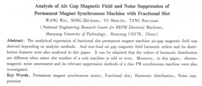 | 分?jǐn)?shù)槽永磁同步電機(jī)氣隙磁場的分析與噪聲抑制     王巍,宋志環(huán),于慎波,唐任遠(yuǎn) (沈陽工業(yè)大學(xué)國家稀土永磁電機(jī)工程技術(shù)研究中心,沈陽110178)     摘要:運(yùn)用解析的方法推導(dǎo)了分?jǐn)?shù)槽永磁同步電機(jī)氣隙磁場的解析表達(dá)式,分析了空載氣隙磁場的諧波次數(shù)與頻率的分布特性,通過推導(dǎo)得出,在單元電機(jī)定子槽數(shù)為奇數(shù)及偶數(shù)時,諧波分布的次數(shù)不同。同時對一臺盤式電機(jī)進(jìn)行電磁噪聲計(jì)算及抑制方法研究,分析了計(jì)算極弧同數(shù)、定子槽深與總氣隙長度的比值等參數(shù),對噪聲抑制的作用。 關(guān)鍵詞:永磁同步電機(jī);分?jǐn)?shù)槽;諧波分布;噪聲抑制 中圖分類號:tm351;tiv1341    文獻(xiàn)標(biāo)志碼:a    文章編號:1001-6848f 2010)06 0001 06 0 引 言     定、轉(zhuǎn)子諧波磁場相互作用產(chǎn)生的低階力波,或頻率與定子固有頻率相近的力波,是引起電機(jī)電磁振動與噪聲的主要原因。確定定子、轉(zhuǎn)子磁密諧波次數(shù)及幅值,是計(jì)算電磁噪聲及確定噪聲源的關(guān)鍵。分?jǐn)?shù)槽永磁同步電機(jī)中,定子側(cè)產(chǎn)生磁密的基波及諧波計(jì)算公式與普通電機(jī)的公式相同。而永磁體產(chǎn)生磁密的諧波分布相對復(fù)雜。運(yùn)用有限元的方法可以計(jì)算出永磁體產(chǎn)生的磁密分布,并通過諧波分析獲得諧波分布,但不能明確各量之間及其與諧波次數(shù)與幅值問的解析關(guān)系,不便于噪聲抑制。針對永磁同步電機(jī)空載氣隙磁場解析表達(dá)式的研究幾近成熟,并且在考慮定子開槽的影響時,一致認(rèn)為磁場的諧波次數(shù)為np±in,p為電機(jī)極對數(shù),n為定予槽數(shù),n=l,3,5…。本文將采取簡化的于段證明多極少槽永磁同步電機(jī),其空載諧波磁場的分布次數(shù)在單元電機(jī)定子槽數(shù)為奇數(shù)及偶數(shù)時不同。采取的方法是蔭.先分析定子不開槽情況永磁體磁密方波的諧波分布,然后分析定子開槽對氣隙磁密的影ⅱ向。通過該表達(dá)式能更清楚地分析出諧波產(chǎn)生的原因,及各參量與諧波分布的關(guān)系,有利于噪聲的分析與抑制。 1永磁體產(chǎn)生磁密分布的解析表達(dá)式 1. 1定子不開槽時永磁體產(chǎn)生氣隙磁密分布   本文采用的模型及推導(dǎo)的公式適用于徑向充磁的徑向結(jié)構(gòu)永磁同步電機(jī)磁場分布、及軸向充磁盤式永磁同步電機(jī)中的單邊結(jié)構(gòu)、外轉(zhuǎn)子結(jié)構(gòu),及內(nèi)轉(zhuǎn)子ns磁路結(jié)構(gòu)電機(jī)某一半徑處的磁場分布。以單元電機(jī)為研究對象,p1表示其極對數(shù),z1為定子槽數(shù),本文分別討論z1為奇數(shù)及偶數(shù)情況。分析時,在定、轉(zhuǎn)子的某一相對位置處,將電機(jī)沿轉(zhuǎn)子表面展開,相對位置及坐標(biāo)原點(diǎn)的確定以計(jì)算方便為準(zhǔn)則。設(shè)定子不開槽時,電機(jī)為均勻氣隙,定子開槽后,總氣隙長度變成隨位置變換的周期函數(shù),δ、δ(x)分別為定子不開槽及開槽時總氣隙長度隨位置的變化。在某一時刻,定子開槽情況永磁體產(chǎn)生磁密的表達(dá)式可以表示為:   首先忽略漏磁及飽和,在導(dǎo)出表達(dá)式后,分別以漏磁系數(shù)δ0和飽和系數(shù)kδ來表示漏磁和磁路飽和的影響。設(shè)轉(zhuǎn)子表面光滑,定子開槽,b0、ho、t1、b1、τ、δ分別代表槽口寬、槽深、齒距、齒頂寬、極距及總氣隙長度(永磁體磁化方向長度hm與氣隙長度δ0之和)。定義單元電機(jī)電角度為2π,t11、b11、τ及b0,分別為t1、b1、τ及b0的電角度值,如式(2)所示。dc為單元電機(jī)氣隙平均直徑。     首先推導(dǎo)p1為偶數(shù)情況。   定子不開槽時,永磁體產(chǎn)生氣隙磁密方波分布及坐標(biāo)選取如圖1所示。 式中,αi為計(jì)算極弧因數(shù);bδ為永磁體產(chǎn)生方波磁密的幅值(t),bδ=bτhm/(hm+δ0);bτ為永磁體剩磁(t)l。 將brδ(x)進(jìn)行傅里葉變換,得氣隙磁密表達(dá)式如式(4)所示。   經(jīng)推導(dǎo),p1為奇數(shù)時氣隙磁密表達(dá)式與p1   |