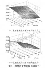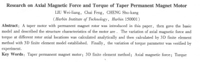 | 錐形轉(zhuǎn)子永磁電機軸向磁拉力和轉(zhuǎn)矩參數(shù)分析 劉偉亮,柴鳳,程樹康 (哈爾濱工業(yè)大學(xué)哈爾濱150001)     摘要:介紹r-種采用永磁式轉(zhuǎn)子的錐形電機,給出了這類電機的模型,分析了其結(jié)構(gòu)特點以及不同轉(zhuǎn)子位置下的軸向磁拉力和轉(zhuǎn)矩的變化情況,并建立電機的三維有限元模型進行了仿真計算,得出轉(zhuǎn)子的軸向磁拉力和轉(zhuǎn)矩與轉(zhuǎn)子的軸向位移之間的關(guān)系,最后轉(zhuǎn)矩參數(shù)的變化規(guī)律通過實驗得到了驗證。 關(guān)鍵詞:錐形轉(zhuǎn)子永磁電機;三維有限元;軸向磁拉力;轉(zhuǎn)矩 中圖分類號:tm351    文獻標志碼:a    文章編號:1001-6848(2010)06-0007-02 0引  言     錐形轉(zhuǎn)子電機中多采用鼠籠式轉(zhuǎn)子,由于定子內(nèi)圓及氣隙呈錐形,氣隙磁場對轉(zhuǎn)子作用直接導(dǎo)致軸向磁拉力的存在,利用這種特點這種電機多用于起重等要求能夠快速制動的場合。采用永磁式轉(zhuǎn)子后,隨著轉(zhuǎn)子與定子之間的位移不同,氣隙長度隨之幣同。利用氣隙長度的變化,可以很容易的改變電機的氣隙磁場,從而達到調(diào)節(jié)勵磁的作用,因而有望應(yīng)用于弱磁擴速場合;此外,考慮到氣隙長度變大時,電機定轉(zhuǎn)矩減小,因此這種類型電機也可用于要求微風啟動的風力發(fā)電場合。   本文對錐形轉(zhuǎn)子永磁電機的軸向磁拉力及其轉(zhuǎn)矩特性進行分析,研究其變化規(guī)律。 1錐形轉(zhuǎn)子永磁電機軸向磁拉力和轉(zhuǎn)矩的數(shù)學(xué)模型     如圖1所示為錐形轉(zhuǎn)子永磁電機結(jié)構(gòu)示意圖。定子內(nèi)圓呈錐形,轉(zhuǎn)子上布置有永磁體。轉(zhuǎn)子與定子對齊時,氣隙最小,如圖中所示位置1;轉(zhuǎn)子脫出定子的距離為m時,如圖中所示位置2,氣隙長度隨之增大,在定子電流不變的條件下,氣隙磁場會隨著m的增大而變小,因此軸向磁拉力與轉(zhuǎn)矩參數(shù)都會變化。     忽略非線性以及飽和因素的影響,近似認為永磁體審儲存的磁能在轉(zhuǎn)子位移前后不變,氣隙中的磁能為既=丟,,bhdy,其中以表示氣隙區(qū)域。     如圖l中所示,轉(zhuǎn)子與定子對齊時(位置1),氣隙長度為氏,并θ有 困此磁能可表示為下式, 其中,     根據(jù)虛功原理,轉(zhuǎn)子所受的軸向磁拉力和轉(zhuǎn)矩可由磁能計算如下,   可見,隨著轉(zhuǎn)子所處位置的不同,轉(zhuǎn)子所受的軸向磁拉力與轉(zhuǎn)子的軸向位移成線性關(guān)系,隨著軸向位移的變化,軸向磁拉力線性減小,而轉(zhuǎn)矩可能會出現(xiàn)極值,出現(xiàn)極值與否則取決于式(4)中的系數(shù)。 2錐形轉(zhuǎn)子永磁電機的有限元分析     轉(zhuǎn)子處于不同位置下的軸向磁拉力和轉(zhuǎn)矩可通過有限元方法計算得到。為了減少計算量,在電機端部空氣區(qū)域采用遠場單元來模擬外邊界的自然邊界條件[2-5]。所建立的三維有限元計算區(qū)域如圖2所示,圖中只示出定轉(zhuǎn)子區(qū)域。   轉(zhuǎn)子處于一定的位置時,在不同的交直軸電流作用下,軸向磁拉力會隨著氣隙磁場的變化而變化。如圖3所示,直軸電流為增磁性質(zhì)時(i>o),直軸電流越大,氣隙磁場越強,因而軸向磁拉力越大;直軸電流為丟磁性質(zhì)時的情況則相反。交軸電流增大時,由于交軸磁路飽和的影響,軸向磁拉力略為減小。     同時,由圖3可知,一定的電流作用下,軸向磁拉力隨著轉(zhuǎn)子軸向位移的增大而減小。     在定子繞組施加5a電流激勵下,1800電角度范圍內(nèi)的轉(zhuǎn)矩變化情況如圖4所示。   由圖4中可知,在轉(zhuǎn)子轉(zhuǎn)角一定的條件下隨著轉(zhuǎn)子軸向位置的   |