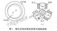 | 一種嚙合式電機結(jié)構(gòu)設(shè)計與轉(zhuǎn)矩分析 丁瑞華,師路歡 (許昌學院電氣信息工程學院,許昌461000)       摘要:針對機器人等對驅(qū)動設(shè)備有空間限制的應(yīng)用場合,提出了一種三相齒輪嚙合式電動機結(jié)構(gòu)。分析了電機的運行原理和磁場特性,給出了控制方式;推導(dǎo)了轉(zhuǎn)矩計算方法。為提高分析精確性,采用ansoft maxwell有限元磁場分析軟件計算,電機轉(zhuǎn)子在不同工作區(qū)域的靜態(tài)轉(zhuǎn)矩。計算結(jié)果表明該電機具有低轉(zhuǎn)速、大扭矩特點。該電機集成了減速機構(gòu),縮短了傳動鏈,結(jié)構(gòu)緊湊,有著較好的應(yīng)用前景。 關(guān)鍵詞:嚙合式電動機;減速機構(gòu);靜態(tài)轉(zhuǎn)矩;有限元 中圖分類號:tm359. 9    文獻標志碼ia    文章編號:1001-6848(2010)06-0009-04 o引  言     近年來,隨著機器人、精密設(shè)備等小型機械裝置的廣泛應(yīng)用,對驅(qū)動電機的續(xù)航能力和空間適應(yīng)性提出了更高要求,國內(nèi)外研究者先后提出和發(fā)展了多種新型的可直接驅(qū)動馬達。其中,直接驅(qū)動型電機傳動精度高,但由于沒有中間傳動裝置,因此受負載變化影響較大,使控制器和驅(qū)動器設(shè)計制造復(fù)雜化。諧波減速器電機由于采用柔輪,所以容易損壞;超聲波電機則利用定轉(zhuǎn)子間摩擦力傳遞能量,因此損耗較大,而且功率密度較低;磁滯伸縮馬達則因其作用距離較小,目前還只是適用于微型機器人。     本文提出了一種齒輪嚙合式電機結(jié)構(gòu),將減速器與電機集成為一體;該電機的磁場特性與磁阻電機有一定的相似性,轉(zhuǎn)子和定子都采用的是軟磁材料;磁場驅(qū)動的方式上與電磁鐵有些相似,主要是利用了磁鐵的吸合特性驅(qū)動轄子運動。設(shè)計了電機的實體結(jié)構(gòu)模型,給出了控制方法;分析了電機的運行原理和轉(zhuǎn)矩,運用有限元軟件ansoft maxwell計算了電機轉(zhuǎn)子在不同轉(zhuǎn)角處的靜態(tài)轉(zhuǎn)矩和磁場特性。 1齒輪嚙合電機運行原理與結(jié)構(gòu) 1.1運行原理     圖1為嚙合式電機的結(jié)構(gòu)和嚙合原理圖。圖l(a)中的外齒輪與圖l(b)中的轉(zhuǎn)子同軸,其軸心為02點;定子與內(nèi)齒圈同軸且固連在一起,其軸心為o1點。外齒輪與內(nèi)齒圈的齒形均采用擺線輪廓,其承載力大,可獲得較高的傳動比,傳動平穩(wěn),嚙合效率較高,廣泛應(yīng)用在內(nèi)嚙合傳動結(jié)構(gòu)中。圖1(a)中的齒輪嚙合狀態(tài)與圖l(b)中的轉(zhuǎn)子位置相對應(yīng);電機的定子具有3個相互獨立的磁極,形狀如圖2所示,轉(zhuǎn)子為圓環(huán)形磁極,定轉(zhuǎn)子均為導(dǎo)磁材 料構(gòu)成;每個定子磁極上分別繞制有1套繞組,單獨自成一相。     當3個磁極a、b、c以一定順序e電t作時,轉(zhuǎn)子將以o1o2為半徑作圓周公轉(zhuǎn)運動。在滿足轉(zhuǎn)子公轉(zhuǎn)半徑等于擺線齒圈和擺線外齒輪的基圓半徑之差條件下,轉(zhuǎn)子就可以直接帶動外齒輪圍繞定子中心o1作公轉(zhuǎn)運動。依據(jù)擺線嚙合原理,將外齒輪將同繞內(nèi)齒圈軸心的高速圓周公轉(zhuǎn)運動轉(zhuǎn)化為擺線外齒輪的低速定軸轉(zhuǎn)動。   根據(jù)擺線減速器傳動原理可以計算該機構(gòu)的傳動比: 式中,zi為齒圈齒數(shù),z0為外齒輪齒數(shù)。     圖2中的定子磁極上安裝有兩個繞組,串聯(lián)在一起。三個定子磁極間沒有磁場耦合,降低了磁場分析難度。 1.2齒輪嚙合電機結(jié)構(gòu)設(shè)計     圖3為本研究設(shè)計的齒輪嚙合式電機實體模型。由于電機的轉(zhuǎn)子運動過程是一種偏心的公轉(zhuǎn)運動,會使電機產(chǎn)生較大的振動。為提高電機運行的穩(wěn)定性,本研究采用兩套磁極機構(gòu),磁極相位相差l80度,兩套磁極的轉(zhuǎn)子和定子分別與兩套齒輪、齒圈嚙合機構(gòu)連接,這種結(jié)構(gòu)可以相互抵消因轉(zhuǎn)子的偏心運動造成的振動問題。     該電機中的字滑塊機構(gòu)可以將外齒輪的自轉(zhuǎn)運動輸出,過濾掉齒輪的公轉(zhuǎn)運動。 2轉(zhuǎn)矩計算分析     由于磁場結(jié)構(gòu)為分布式磁極,磁極間沒有磁揚耦合,僅靠控制電壓的大小控制磁場力,不需要考慮電壓方向。轉(zhuǎn)子受到的磁場力方向與定子空間位置   |