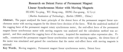 | 基于動磁式永磁同步直線電機定位力的研究 黃玉平,吳紅星,洪作光,李立毅 (哈爾濱工業(yè)大學哈爾濱150001)     摘要:針對永磁同步直線電機定位力大的缺點,文章分析了動磁式永磁i司步電動機的定位力產(chǎn)生的基本原理;借鑒永磁同步旋轉(zhuǎn)電機的齒槽力的分析方法,分析了動磁式永磁同步直線電機的端邊效應定位力,并得出定位力計算方法,分析了齒槽定位力,得出了齒槽定位力的****值表達式,利用軟件建立的永磁同步電機定位力模型.仿真動磁式直線電機的定位力情況,得出動磁式直線電機邊端定位力很小的結(jié)論。 關(guān)鍵詞:動磁式;永磁直線電機;定位力 中圖分類號:tm359.4; tm351;tm341    文獻標志碼:a    文章編號:1001-6848(2010)06-0028-04 0引  言     直線電機是一種將電能直接轉(zhuǎn)換成直線運動的機械能的動力裝置,永磁直線電機的不足之處就是它的定位力比較大。定位力較大會導致電機推力產(chǎn)生較大波動,惡化電機的運行特性,甚至使電機產(chǎn)生振動與噪聲。本文分析了動磁式永磁同步電動機( pmlsm)的定位力產(chǎn)生的基本原理;通過定性的分析邊端定位力,得出pmlsm邊端定位力很小的結(jié)論;借鑒永磁同步旋轉(zhuǎn)電機的齒槽力的分析方法,分析pmlsm的端邊效應定位力,并得出定位力計算方法,分析了齒槽定位力,得出了齒槽定位力的****值表達式。 1永磁同步直線電機推力波動因素     系統(tǒng)內(nèi)部擾動有如下兒種類型:     齒槽推力波動這是由pmlsm動子鐵心寫定子磁場相互作用而產(chǎn)生的。在無電樞電流的情況下,動子運動時,由于動子齒槽的存在或動子鐵心磁阻的變化而產(chǎn)生的推力波動,就是齒槽推力波動。這一推力波動是交變的,它與定子的位置有關(guān),是pmlsm動子結(jié)構(gòu)與永磁勵磁磁場的函數(shù)。   紋波推力擾動  在pmlsm中,為產(chǎn)生恒定推力,要求pmlsm動子電樞反電動勢和由逆變器輸入動子電樞的相電流都必須是正弦的。但實際上,由于動子繞組空間分布形狀的非正弦性、永磁體形狀上的原因以及動子齒槽的存在,反電動勢不可能是正弦的。這樣,必然會引起推力脈動。通常,將這種由反電動勢或動子電流諧波引起的脈動推力稱為紋波推力,紋波推力實質(zhì)上是由pmlsm定子和動子諧波磁場相互作用產(chǎn)生的。     磁阻推力波動這是由pmlsm動子繞組電流激勵磁場與定子磁阻變化相互作用而產(chǎn)牛的推力波動。在^極pmlsm中定子磁阻變化明顯,表現(xiàn)為動子繞     基于動磁式永磁同步直線電機定位力的研究黃玉平,等組自感隨轉(zhuǎn)子位置變化,而對于采用表面凸裝式磁極pmlsm,其磁阻推力波動對推力平穩(wěn)性的影響較小。     永磁體磁鏈諧波擾動  因為溫度的變化、永磁體充磁的不均勻性、電流過載飽和時的電樞反應等等都會改變永磁體特性,從而導致pmlsm實際運行中f是一個時變量。其影響反映在d軸電壓方程式中,即磁鏈     永磁體磁鏈的變化將直接影響到pmlsm輸出推力的平穩(wěn)性,產(chǎn)生諧波擾動。     端部效應由于鐵心開斷而在氣隙中出現(xiàn)脈振磁場和反向行波磁場的效應,稱為第一類縱向邊緣效應。當直線電動機的動子以很高的速度相對于定子運動時,在定子的進入端和離開端還會產(chǎn)生磁場畸變。這種類型的磁場畸變稱為第二類縱向邊端效應。此外,在扁平型的直線電動機中,當電磁氣隙與初級鐵心寬度的比值較大,而次極的寬度又等于初級鐵心寬度時,則不論有沒有次極的反作用,都必須考慮橫向(即隨著槽的方向)邊緣磁場的削弱,這種效應稱為第一類橫向邊緣效應,當存在次極的反作用時,橫向磁場的分布還受到次極的寬度及其電導率的影響,此時的橫向磁場分布的不均勻稱為第二類橫向邊緣效應。     電阻變化擾動在pmlsm實際運行時.溫度的變化與磁場的飽和會導致pmlsm參數(shù)(動子電樞電阻、動子電樞自感、動子電樞互感)發(fā)生變化。這樣,依據(jù)pmlsm額定參數(shù)并按照經(jīng)典控制理論設計的調(diào)節(jié)器會因參數(shù)變化而導致無法實現(xiàn)所需的零、極點對消,從而造成電流閉環(huán)控制性能降低。這不僅影晌pmlsm的動態(tài)解耦效果,同時也不利于永磁直線同步電動機速度閉環(huán)控制性能的提高。 |