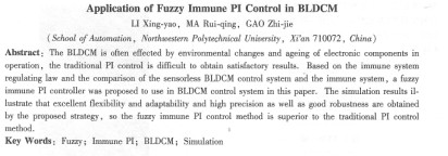 | 模糊免疫pi控制在bldcm中的應(yīng)用 李星耀,馬瑞卿,高志杰 (西北工業(yè)大學(xué)自動化學(xué)院,西安710129)     摘要:由于bldcm在運行中受環(huán)境變化、元件老化等問題影響,傳統(tǒng)的pi控制難以取得滿意的效果。該文通過免疫系統(tǒng)與控制系統(tǒng)的類比,借鑒免疫u向應(yīng)調(diào)節(jié)機理,提出了將模糊免疫pi控制器應(yīng)用bldcm控制系統(tǒng)中。m atlab仿真結(jié)果表明,系統(tǒng)超調(diào)量小,速度響應(yīng)快,對外界干擾得到了很好的抑制,具有較好的控制精度和較好的魯棒性,控制系統(tǒng)性能優(yōu)于常規(guī)pi控制。 關(guān)鍵詞:模糊;免疫pi;bldcm;仿真 中圖分類號:tp273 +.4    文獻標志碼:a    文章編號:1001-6848(2010)06-0096-04 0引  言         傳統(tǒng)的無刷直流電機( bldcm)控制系統(tǒng)大多采用常規(guī)的pid控制策略。由于傳統(tǒng)的pid控制器容易受電機參數(shù)變化和負載擾動等不確定性因素的影響,而且對動態(tài)響應(yīng)和抗干擾能力兩者不能很好地兼顧,為了克服這些不足,多種控制策略相繼被提出,如數(shù)字pid、模糊pid、自適應(yīng)pid和神經(jīng)網(wǎng)絡(luò)控制等等。   本文通過對免疫系統(tǒng)與無刷直流電機( bldcm)控制系統(tǒng)的類比,將模糊免疫pi控制器應(yīng)用于無刷直流電機控制系統(tǒng)中,模糊免疫pi控制既繼承了傳統(tǒng)pi控制不依賴于對象模型、控制結(jié)構(gòu)簡單、可靠性高、易于工程實現(xiàn)等優(yōu)點,又克服了傳統(tǒng)pi控制器抗干擾能力較差,超調(diào)大,且對系統(tǒng)參數(shù)擾動的魯棒性不強等缺點。通過matlab/simulink進行仿真。結(jié)果表明,該控制方法與傳統(tǒng)pi相比,響應(yīng)速度快,抗擾動能力和魯棒性強,系統(tǒng)的動、靜態(tài)性能都大大提高了。 1生物免疫系統(tǒng)調(diào)節(jié)機理   生物免疫系統(tǒng)可認為是一種在大量干擾和不確定性的環(huán)境中都具有很強魯棒性和自適應(yīng)性的系統(tǒng),能對侵入機體的菲己成分以及發(fā)生了突變的自身細胞進行精確識別、適度響應(yīng)和有效排除;沒有免疫系統(tǒng)的保護,生物體不可避免地會受到感染進而導(dǎo)致死亡。生物免疫系統(tǒng)中各細胞的相互作用表現(xiàn)為:抗原侵入肌體后,經(jīng)抗原呈遞細胞( apc)吸收、消化后,將信息呈遞給t細胞然后刺激b細胞,b細胞受到刺激便會產(chǎn)生抗體以消除抗原。當抗原較多時,肌體內(nèi)的輔助細胞th也較多,而抑制細胞ts卻較少,從而產(chǎn)生較多的b細胞。隨著抗原數(shù)量的減少,體內(nèi)抑制細胞ts則增加,抑制輔助細胞th的產(chǎn)生,b細胞也隨之減少,經(jīng)過一段時間間隔后,免疫反饋的整個系統(tǒng)就趨于一種平衡。在免疫響應(yīng)的各個階段t細胞是扮演了不同的角色,從免疫初期的輔助細胞th的大量產(chǎn)生盡快免疫抗原到免疫后期抑制細胞ts的快速產(chǎn)生以使得系統(tǒng)趨于穩(wěn)定,所以t細胞的調(diào)節(jié)作用是值得借鑒的。th細胞和t。細胞的調(diào)節(jié)過程就可以分別視為免疫應(yīng)答的正反饋調(diào)節(jié)和負反饋調(diào)節(jié)過程。 2模糊免疫pi控制器設(shè)計 2.1免疫控制器設(shè)計原理     將免疫系統(tǒng)與bldcm控制系統(tǒng)類比,免疫響應(yīng)的主要功能是在保證免疫系統(tǒng)穩(wěn)定的同時,快速響應(yīng)入侵抗原。一方面抗原對生物體產(chǎn)生傷害,必須及時予以消除;另~方面抗體濃度太大,也會對生物體產(chǎn)生毒害,必須受到控制,免疫系統(tǒng)的總目標是使生物體受到的總傷害最小。而bldcm控制系統(tǒng)在動態(tài)調(diào)節(jié)過程中,要求系統(tǒng)在保證穩(wěn)定性的前提下,具有較好的動態(tài)性能,即具有較小的超調(diào)和較快的響應(yīng)速度,并能快速消除偏差,這與免疫系統(tǒng)的控制目的是一致的。免疫系統(tǒng)與bldcm控制系統(tǒng)的比較如表l所示。     根據(jù)免疫響虛過程中t細胞的作用,可得到第k代b細胞的濃度表達式:     定義第k代的抗原數(shù)量為ε(k),受到外部刺激后輔助細胞th的數(shù)量為th(k),則有: 式中,k1為th細胞的促進因子,假設(shè)抑制細胞對b細胞的影響為tε(k)則: |