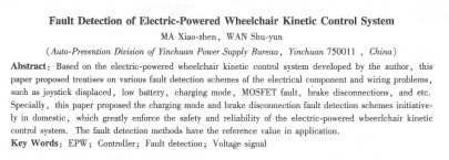 | 電動(dòng)輪椅運(yùn)動(dòng)控制系統(tǒng)故障檢測(cè)方法研究 馬小珍,萬(wàn)淑蕓 (銀川供電局保護(hù)自動(dòng)化所,銀川750011)     摘要:以自行研制的電動(dòng)輪椅運(yùn)動(dòng)控制系統(tǒng)為對(duì)象,論述了電動(dòng)輪椅運(yùn)動(dòng)控制系統(tǒng)各種常見(jiàn)電氣元件故障和接線故障檢測(cè)方法,主要有:操縱桿不在中心位置檢測(cè)、電池故障、充電模式檢測(cè)、mos管故障以及剎車未連接故障等。提出充電模式故障檢測(cè)方法和基于電壓信號(hào)的電剎車未連接故障等故障的檢測(cè)方法,極大的提高電動(dòng)輪椅運(yùn)動(dòng)控制系統(tǒng)的安全性和可靠性,具有一定的參考指導(dǎo)價(jià)值。 關(guān)鍵詞:電動(dòng)輪椅;控制器;故障檢測(cè);電壓信號(hào) 中圖分類號(hào):tp271+4:tp277    文獻(xiàn)標(biāo)志碼:a    文章編號(hào):1001-6848(2010)06-0088-02 o引  言   作為一個(gè)全數(shù)字化的電動(dòng)輪椅運(yùn)動(dòng)控制系統(tǒng),它應(yīng)能自動(dòng)實(shí)時(shí)地進(jìn)行故障診斷、故障定位、事故緊急處理以及報(bào)警等,并在液晶屏上進(jìn)行顯示,當(dāng)輪椅正在運(yùn)行時(shí)如果檢測(cè)出故障,系統(tǒng)應(yīng)能使輪椅安全地停下來(lái)并鎖定;當(dāng)輪椅靜止時(shí)如果被檢測(cè)出故障,系統(tǒng)應(yīng)能夠立即鎖定輪椅[34]。作者經(jīng)仔細(xì)分析和研究,得出電動(dòng)輪椅運(yùn)動(dòng)控制系統(tǒng)應(yīng)具備的常見(jiàn)故障檢測(cè)項(xiàng)目如下:     (1)操縱桿故障;     (2)電池故障;     (3)充電模式檢測(cè);     (4) mos管故障;     (5)剎車故障(包括左/右剎車)。 1各種故障檢測(cè)算法研究 1.1操縱桿故障     最常見(jiàn)的操縱桿故障是在電動(dòng)輪椅控制器上電之前,操縱桿可能由于某種原因偏離了中心位置,在上電初期,在完成程序初始化工作以后,就首先檢測(cè)操縱桿是否在中心位置,如果不在中心位置,則鳴笛報(bào)警5s,并在液晶屏上提示“操縱桿不在中心位置”,如果5s之內(nèi),釋放操縱桿使其回歸中心位置,則輪椅正常運(yùn)行,否則,5s之后,輪椅將被鎖死。程序流程圖如圖1所示。 1.2電池故障     電動(dòng)輪椅的電池電量的檢測(cè)是通過(guò)ad采樣并轉(zhuǎn)化為十進(jìn)制數(shù)在液晶顯示器上輸出。當(dāng)控制系統(tǒng)檢測(cè)到電池電壓低于某下限時(shí),即不足以驅(qū)動(dòng)電機(jī)時(shí),控制器會(huì)報(bào)警一段時(shí)間:如果輪椅此時(shí)正在運(yùn)行,則控制器報(bào)警1 rmn后封管抱閘,以給用戶足夠的時(shí)間停車;如果輪椅靜止,則控制器報(bào)警5s后封管抱閘。同時(shí)液晶顯示電池電壓不足,給出充電提示。當(dāng)電池電壓低于某下限時(shí),當(dāng)輪椅在起/制動(dòng)時(shí),負(fù)載電流較大,此時(shí)ad采樣所得到的電壓值比正常時(shí)要小得多,尼然不是真實(shí)的電池電壓值,這就需要對(duì)采樣值進(jìn)行濾波處理。本文采用程序判斷濾波法,根據(jù)經(jīng)驗(yàn)判斷確定兩次采樣允許的****偏差δy,若先后兩次的采樣值的差值大于δy,則表明輸入信號(hào)是干擾信號(hào),應(yīng)該去掉,而將上次采樣值作為本次采樣值;若小于ay,則本次采樣值有效。在本文中取δy=5 v。 1.3    mos管故障檢測(cè)方法     電動(dòng)輪椅運(yùn)動(dòng)控制系統(tǒng)調(diào)速示意圖如圖2所示。     由圖2見(jiàn),電動(dòng)輪椅運(yùn)動(dòng)控制系統(tǒng)共有兩個(gè)h橋,四個(gè)下管。下面僅以一個(gè)下管為例來(lái)說(shuō)明故障信號(hào)產(chǎn)生電路的工作原理。如圖3所示,mcp14066是一個(gè)多路選擇器,當(dāng)控制端為高電平時(shí),相應(yīng)的輸入端信號(hào)就會(huì)從對(duì)應(yīng)的輸出端輸出;當(dāng)控制端是低電平的時(shí)候,不論輸入端是什么信號(hào),輸出總為低,也就是說(shuō)14066相當(dāng)于一個(gè)與門。由于mos管的漏極和柵極的信號(hào)總是反相的,所以結(jié)合mcp14066多路選擇器的特點(diǎn),把mos管的柵極驅(qū)動(dòng)信號(hào)作為多路選擇器的控制信號(hào),而把mos管的漏極電平作為輸入信號(hào);然而當(dāng)mos管斷路而柵極驅(qū)動(dòng)為高電平時(shí),由于mos管沒(méi)有導(dǎo)通,故多路選擇器的輸出就為高電平,這就是故障信號(hào);當(dāng)mos管短路時(shí),上下管就會(huì)在瞬間直通而****燒毀。這就是mos管斷路故障檢測(cè)的原理。 1.4充電模式檢測(cè) |