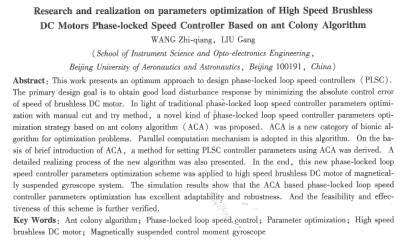 | 高速無刷直流電機鎖相轉(zhuǎn)速控制器參數(shù)蟻群優(yōu)化 王志強,劉  剛 (北京航空航天大學(xué)儀器科學(xué)與光電工程學(xué)院,北京100191)     摘要:針對當(dāng)前鎖相速度控制器的參數(shù)整定多采用試驗加試湊的方式由人工進(jìn)行優(yōu)化,提出了一種以快捕帶為目標(biāo)函數(shù)的鎖相速度控制器新型蟻群參數(shù)優(yōu)化策略。建立了目標(biāo)函數(shù),推導(dǎo)了蟻群算法鎖相速度控制器參數(shù)優(yōu)化方法,并給出了新算法的具體實現(xiàn)步驟,最后將該優(yōu)化方案用于磁懸浮控制力矩陀螺的高速無刷直流電機速度控制。仿真研究表明,該鎖相速度控制器參數(shù)優(yōu)化策略具有很強的適應(yīng)性、魯棒陛,進(jìn)而通過實驗驗證了該方案的可行性和有效性。 關(guān)鍵詞:蟻群算法;鎖相速度控制;參數(shù)優(yōu)化;高速無刷直流電機;磁懸浮控制力矩陀螺 中圖分類號:tm36 +1    文獻(xiàn)標(biāo)志碼:a    文章編號:1001-6848(2010)06-0054-05 0引  言     在電機調(diào)逮領(lǐng)域,鎖相速度控制技術(shù)在高精度速度控制方面具有獨特的優(yōu)勢,當(dāng)電機的反饋信號和參考頻率信號同步時,轉(zhuǎn)速的穩(wěn)態(tài)精度可達(dá)百分之0 1~0. 02,遠(yuǎn)優(yōu)于傳統(tǒng)pid控制。電機鎖相控制的研究重點是改善動態(tài)性能和抗干擾性能,其中采用雙模速度控制不僅避免了鑒相器的非線性工作區(qū),并且能夠獲得良好的動態(tài)性能和較高的穩(wěn)態(tài)精度。文獻(xiàn)[2]采用模型參考自適應(yīng)理論動態(tài)調(diào)節(jié)鎖相環(huán)環(huán)路增益,加快了受到負(fù)載轉(zhuǎn)矩干擾時電機轉(zhuǎn)速的恢復(fù)過程,兼顧了穩(wěn)態(tài)精度和抗負(fù)載擾動的能力,但文中沒有具體給出鑒頻鑒相增益和低通濾波器時間常數(shù)等環(huán)路參數(shù)的整定方法,而鎖相環(huán)的環(huán)路參數(shù)的選擇,對環(huán)路的性能影h向較大。在實際應(yīng)用中,一般采用試驗加試湊的整定方法,這對運行狀況的適應(yīng)性不能保證,因此,研究和尋求鎖相控制器參數(shù)的自動整定和優(yōu)化方法,以適應(yīng)復(fù)雜的工況和高指標(biāo)的控制要求,成為鎖相調(diào)速技術(shù)應(yīng)用的重要課題。     蟻群算法是由m.dorigo等提出的一種全新的模擬進(jìn)化算法,在解決旅行商問題、二次分配問題     高速無刷直流電機鎖相轉(zhuǎn)速控制器參數(shù)蟻群優(yōu)化王志強,等等應(yīng)用中表現(xiàn)出相當(dāng)好的性能,該算法采用正反饋搜索機制和啟發(fā)式策略,具有魯棒性強、適于并行處理,對一般函數(shù)優(yōu)化問題性能優(yōu)異,對不連續(xù)、不可微、局部極值點密集的函數(shù),同樣具有很好的尋優(yōu)能力。本文提出了一種基于蟻群算法的鎖相速度控制器自動整定參數(shù)優(yōu)化方法,給出了具體的優(yōu)化步驟。仿真研究表明,該鎖相速度控制器參數(shù)優(yōu)化策略具有很強的適應(yīng)性和魯棒性,并在磁懸浮控制力矩陀螺用高速永磁無刷直流電機上的驗證了該方案的可行性和有效性。 1問題描述     鎖相電機速度控制( plsc)系統(tǒng)主要由鑒頻鑒相器( pfd)、環(huán)路濾波器(lpf)及壓控振蕩器(vc0)等三個基本部件組成,如圖1所示。其中,最為關(guān)鍵的部件是鑒相器,其輸出一般呈現(xiàn)出非線性的特性,只在鎖相環(huán)接近鎖定時才呈現(xiàn)線性比例特性。在電動機鎖相調(diào)速系統(tǒng)中,用轉(zhuǎn)矩控制器、電動機和光電碼盤取代vc0,電動機的輸出轉(zhuǎn)速經(jīng)光電碼盤或霍爾轉(zhuǎn)子位置傳感器轉(zhuǎn)化為與電動機轉(zhuǎn)子轉(zhuǎn)速成比例的脈沖信號,pfd比較參考輸入脈沖信號與光電碼盤或霍爾轉(zhuǎn)子位置傳感器輸出的脈沖信號的相位。     電動機的動態(tài)特性使鎖相調(diào)速系統(tǒng)成為比電子鎖相環(huán)高一階的系統(tǒng),其動態(tài)特性使鎖相調(diào)速系統(tǒng)在性能和要求上與電子鎖相環(huán)有著明顯的不同,與電子鎖相環(huán)相比,鎖相調(diào)速系統(tǒng)時間常數(shù)大、頻率低、調(diào)速范圍寬。因電動機存在大的機械慣量,使系統(tǒng)的帶寬變窄,系統(tǒng)的時問常數(shù)比電子鎖相環(huán)要大得多,系統(tǒng)很難靠頻率牽引作用入鎖。為此本文采用雙模速度控制,系統(tǒng)結(jié)構(gòu)如圖2所示,包括速度控制器和轉(zhuǎn)矩控制器兩部分。   速度控制器有兩種模式,pid控制和鎖相控制。當(dāng)速度誤差的****值大于預(yù)先設(shè)定的誤差帶時,只有速度pid控制作用,使電機迅速加速或減速,文中采用了文獻(xiàn)[ 9-11]的pid蟻群優(yōu)化算法對速度pid控制器進(jìn)行參數(shù)整定。當(dāng)速度誤差的****值小于預(yù)先設(shè)定的誤差帶時,轉(zhuǎn)入鎖相控制模式,在穩(wěn)態(tài)只有鎖相控制作用,使系統(tǒng)獲得高的穩(wěn)態(tài)精度。plsc系統(tǒng)在鑒頻鑒相階段的數(shù)學(xué)模型為 |
