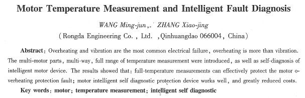 | 電機(jī)本機(jī)測(cè)溫與故障智能診斷     王明軍,  張曉謹(jǐn) (秦皇島融大工程技術(shù)有限公司,河北秦皇島066004)      摘要:過熱和振動(dòng)是最常見的電機(jī)故障,其中過熱又比振動(dòng)故障多得多。介紹了電機(jī)的多部位、多方式、全方位溫度測(cè)量,以及電機(jī)的智能自診斷裝置。實(shí)施結(jié)果表明:全方位溫度測(cè)量町有效診斷電機(jī)的過熱故障;電機(jī)的智能自診斷裝置效果良好,且大大降低了成本。     關(guān)鍵詞:電機(jī):溫度測(cè)量:智能自診斷裝置     中圖分類號(hào):TM 307文獻(xiàn)標(biāo)志碼:A文章編號(hào):1673_6540(2010)06-045-05 0 引言      過熱和振動(dòng)是最常見的電機(jī)故障。其中軸承、繞組由于過熱而導(dǎo)致電機(jī)燒毀的故障,要比振動(dòng)故障多得多。振動(dòng)故障比較直觀,故障的惡化相對(duì)緩慢,直接或間接反映的故障有限。過熱故障原因較多,表觀性差,故障惡化較快,過熱現(xiàn)象能夠直接或間接反映的故障也是電機(jī)最多見和所占比例相當(dāng)大的故障。因此,監(jiān)測(cè)溫度對(duì)于保證電機(jī)正常運(yùn)行、分析故障原因尤為重要。     由于制造、測(cè)量保護(hù)成本昂貴等原因,一般針對(duì)較大容量的電機(jī),在軸承、繞組部位安裝不同類型鉑熱電阻傳感器,并引出到電機(jī)外殼上的傳感器接線盒中,再通過信號(hào)電纜送至溫度顯示儀表,或由計(jì)算機(jī)遠(yuǎn)程測(cè)取數(shù)據(jù)。     鑒于各種鉑熱電阻傳感器的熱響應(yīng)時(shí)間0.5,相差較大,特別是固定螺紋式鉑熱電阻傳感器的測(cè)溫端處于測(cè)溫孔的空氣熱室中,與測(cè)溫孔壁、底部非直接接觸,加上軸承套存在熱阻,軸承運(yùn)轉(zhuǎn)產(chǎn)生的熱量經(jīng)過軸承外圈、軸承套、測(cè)溫?zé)崾抑械目諝鈱樱賯鬟f到傳感器的測(cè)溫端,勢(shì)必存在溫度降。因此,測(cè)溫?cái)?shù)值與實(shí)際溫度存在較大的時(shí)間差,導(dǎo)致報(bào)警、保護(hù)滯后和失控。 1  電機(jī)的多部位溫度測(cè)量    (1>由于電機(jī)軸承和繞組是運(yùn)行中過熱故障最多、導(dǎo)致燒損頻繁的部位,對(duì)其進(jìn)行溫度監(jiān)測(cè)是必不可少的。     (2)除此之外,鐵心也是電機(jī)發(fā)熱較嚴(yán)重的部位,鐵心過熱同樣預(yù)示著存在故障,如鐵心片間短路、局部鐵心損壞、高次諧波較嚴(yán)重、繞組匝間短路、定轉(zhuǎn)子摩擦、風(fēng)道堵塞、冷卻介質(zhì)溫度不正常等,對(duì)于較重要的電機(jī),鐵心溫度的測(cè)量也不容忽視。     (3)負(fù)載波動(dòng)、冷卻介質(zhì)溫度的變化、冷卻風(fēng)扇缺損、轉(zhuǎn)子斷條等故障,將導(dǎo)致出風(fēng)口風(fēng)溫發(fā)生變化。因此,監(jiān)測(cè)出風(fēng)口溫度,也有益于電機(jī)的保護(hù)和故障診斷。 2  電機(jī)的多方式溫度測(cè)量     (1)常見的各種電機(jī),其溫度測(cè)量都是采取溫度上限測(cè)量的方式。通過安裝在負(fù)荷側(cè)和非負(fù)荷側(cè)軸承室、三相繞組端部或槽內(nèi)的測(cè)溫傳感器對(duì)軸承、繞組的工作溫度進(jìn)行監(jiān)測(cè),當(dāng)被測(cè)溫度達(dá)到設(shè)定溫度上限的闕值時(shí),表明此部位過熱,超過許用值,出報(bào)警保護(hù)信號(hào)。該溫度上限測(cè)量的方式,只是監(jiān)控被測(cè)部位的溫度上限,對(duì)于被測(cè)部位的溫度不平衡、低溫環(huán)境下的溫升過度情況,起不到保護(hù)作用。特別是在負(fù)載波動(dòng)嚴(yán)重,溫度急劇升高時(shí),不能有效預(yù)警和保護(hù)。     (2)溫差測(cè)量方式。電機(jī)運(yùn)行中,某一側(cè)軸承的振動(dòng)、潤(rùn)滑脂過少或缺油、軸承晚期損傷、菜一側(cè)軸瓦矧隙過小或供油不良、軸瓦潤(rùn)滑油溫過高及軸電流等,都將會(huì)引起兩側(cè)軸承溫度存在溫度差。同樣,某一相繞組匾間短路、缺相運(yùn)行、三相電壓或電流嚴(yán)重小平衡、定轉(zhuǎn)子鐵心摩擦、局部鐵心損壞或短路、局部風(fēng)道堵塞等,將引起繞組之間存在溫度差。由于繞組、鐵心等埋置測(cè)溫元件的測(cè)溫點(diǎn)往往不是發(fā)熱的****部位,溫度上二限測(cè)量的有效性受到限制。因此,對(duì)溫差進(jìn)行測(cè)量,有利于在隱患發(fā)展成更嚴(yán)重故障之前發(fā)現(xiàn)問題。     (3)溫升測(cè)量方式。電機(jī)繞組的溫升限值標(biāo)準(zhǔn)是以環(huán)境溫度40 qC為基礎(chǔ)制定的。溫升是電機(jī)設(shè)汁及運(yùn)行中的一項(xiàng)鶯要指標(biāo),標(biāo)志著電機(jī)的發(fā)熱程度,如電機(jī)溫升突然增大,說明電機(jī)有故障,如:風(fēng)道阻塞或負(fù)荷太重。在使用環(huán)境溫度或冷卻介質(zhì)溫度偏低情況,如寒冷地區(qū)、野外工作條件下,電機(jī)的過負(fù)載、繞組匝間或?qū)訂柖搪、電壓或電流不平衡、電網(wǎng)電壓偏高或電源諧波分量較大、風(fēng)道堵塞或通風(fēng)不良、轉(zhuǎn)子斷條或匝間短路等故障,會(huì)出現(xiàn)繞組溫升超過限值,但可能并未超絕緣等級(jí)許用的溫度上限,也就是說,在環(huán)境溫度較低時(shí),溫升過高表明超過設(shè)計(jì)溫升值,屬于不正常情況。其次,測(cè)溫傳感器處于散熱較好的部位,若達(dá)劍郴,其他熱點(diǎn)巳嚴(yán)重超限,對(duì)此部位只能用溫