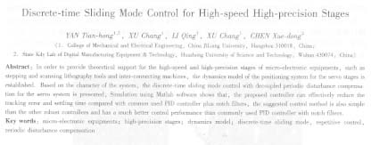 | 高速超精運(yùn)動臺的離散滑模控制研究 嚴(yán)天宏1,2 許暢1,李青1,許昌1,陳學(xué)東2 (1、中國計(jì)量學(xué)院機(jī)電工程學(xué)院,浙江 杭州 310018,2、華中科技大學(xué) 數(shù)字制造與裝備技術(shù)國家重點(diǎn)實(shí)驗(yàn)室,湖北 武漢 430074)       l引言     隨著芯片集成度的不斷提高、器件尺寸的不斷縮小,光刻技術(shù)和光刻設(shè)備、封裝設(shè)備、數(shù)控技術(shù)等發(fā)生著顯著的變化,對于光刻機(jī)來講,為了方便維護(hù)、裝機(jī),降低維護(hù)時間、費(fèi)用以及運(yùn)行成本,需要模塊化的設(shè)計(jì);對于高速高精工作臺,無論在設(shè)計(jì)、建模、控制方法等方面都需要****的性能;因此國內(nèi)許多研究者都對涉及工作臺的相關(guān)技術(shù)展開了研究。目前在工業(yè)工作臺的伺服控制上,大多采用pid串聯(lián)濾波器,加上前饋進(jìn)行控制,大多數(shù)情況下控制效果較好,但由于有些工作臺運(yùn)動范圍大,不同位置帶來的模型變化較大,對性能與魯棒性均帶來了無法克服的缺點(diǎn),在20世紀(jì)70年代開始研究滑模變結(jié)構(gòu)控制,對干擾和模型不確定性有很大提高,隨著對滑?刂萍夹g(shù)的不斷發(fā)展,近年來已經(jīng)逐漸應(yīng)用到精密伺服控制中。由于硅片單元或芯片規(guī)則分布,因此在光刻、封裝過程中,工作臺一般是按照一定路徑做掃描和步進(jìn)運(yùn)動,因此工作中會產(chǎn)生固定的周期性干擾,本文首先根據(jù)工作臺系統(tǒng)的設(shè)計(jì)特點(diǎn),建立了系統(tǒng)的數(shù)學(xué)模型,對其著重研究了具有解耦的周期性干擾補(bǔ)償器的離散滑模變結(jié)構(gòu)控制技術(shù),有效地解決了精密系統(tǒng)伺服控制模型不確定性和干擾帶來的性能損失問題。 2-種典型大行程高承載精密工作臺系統(tǒng)結(jié)構(gòu)   本文描述的是一種超精密運(yùn)動臺系統(tǒng)可用于微納電子制造與封裝設(shè)備、精密數(shù)控裝備等,精密運(yùn)動臺三維結(jié)構(gòu),如圖1所示。     工作臺系統(tǒng)一般是普通工作臺速度的4~5倍,性能要求很苛刻。超精工作臺一般采用宏微驅(qū)動,主要由一個長行程直線電機(jī)(粗動臺)、3個短行程電機(jī)(微動臺)、大理石基座和物料卡盤以及其氣浮系統(tǒng)等組成,其位置用激光干涉儀來測量。短行程電機(jī)具有3個獨(dú)立的線圈,線圈裝配在y向直線電機(jī)的動子驅(qū)動臂上,電機(jī)的磁極掩?ūP的一部分;按洛侖茲馬達(dá)工作原理,靠氣足浮起的在大理石上的物料卡盤在電磁力作用下可作無機(jī)械接觸的運(yùn)動。短行程電機(jī)的一個線圈沿x向工作,其他兩線圈沿y向工作,用于實(shí)現(xiàn)微動臺蓋,y和rz三個自由度的小范圍精確調(diào)整;長行程直線電機(jī)實(shí)現(xiàn)粗動臺r方向一個自由度的長行程運(yùn)動;整個工作臺系統(tǒng)實(shí)現(xiàn)蓋,y和rz三個自由度的精密控制并實(shí)現(xiàn)y方向的長行程精密定位與高速運(yùn)行。短行程電機(jī)的行程非常小(±1.5 mm),但精度非常高(10 nm以內(nèi));移動短行程裝配體的長行程電機(jī)具有大的行程(400 mm),但其精度相對較低(μm級)。掩模卡盤和長行程動子之間的相對運(yùn)動由差分傳感器(圖1中未示出)來檢測。在短行程電機(jī)的驅(qū)動力作用下,當(dāng)物料卡盤運(yùn)動時,差分傳感器檢測到其運(yùn)動并觸發(fā)長行程直線電機(jī)運(yùn)動。由于使用了差分傳感器和氣浮結(jié)構(gòu),使得微動臺和粗動臺之間除了電磁相互作用力外不存在其他耦合影響。短行程電機(jī)工作于激光干涉儀控制模式;長行程直線電機(jī)工作于差分傳感器控制模式,其跟隨物料卡盤或者說是短行程電機(jī)進(jìn)行運(yùn)動。這就是所謂的主從控制工作原理。在引線鍵合、掃描光刻機(jī)中,物料工作臺和對準(zhǔn)工作臺協(xié)同運(yùn)動以實(shí)現(xiàn)目標(biāo)的曝光動作。為滿 足不同運(yùn)動臺之間的同步運(yùn)動和微電子制造中高質(zhì)高產(chǎn)的要求,伺服工作臺系統(tǒng)均需具有非常精確的定位精度和較高的加速度要求。例如掩模臺系統(tǒng)的運(yùn)行速度是硅片臺的4倍,能達(dá)到的物理極限指標(biāo)和定位精度等參數(shù),見表l。     因此,有必要對這類微納精密平臺的動力學(xué)模型與控制器設(shè)計(jì)進(jìn)行研究,井對系統(tǒng)進(jìn)行仿真,研究其運(yùn)動性能,為系統(tǒng)性能的優(yōu)化設(shè)計(jì)提供指導(dǎo)。 3運(yùn)動系統(tǒng)的動力學(xué)與控制建模     進(jìn)行高速超精的物料臺運(yùn)動系統(tǒng)的控制,首先需要處理的問題包括物理測量系統(tǒng)的變換、驅(qū)動系統(tǒng)的增益匹配或驅(qū)動解耦等,并建立系統(tǒng)的動力學(xué)模型;然后進(jìn)行軌跡規(guī)劃,反饋控制設(shè)計(jì)、前饋補(bǔ)償,以及其他先進(jìn)的補(bǔ)償、權(quán)函數(shù)選取等。使用   |