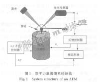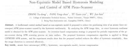 | 基于變比模型的afm掃描器遲滯建模與控制     張玉東1,方勇純l,余冠云2,吳浚瀚2 (1南開(kāi)大學(xué)信息技術(shù)科學(xué)學(xué)院,天津300071;2本原納米儀器有限公司,廣東廣州510070)     摘    要:針對(duì)遲滯非線性引起的壓電掃描器定位不準(zhǔn)確問(wèn)題,提出一種基于變比模型的遲滯前饋控制方法。通過(guò)分析原子力顯微鏡( afm)掃描圖像數(shù)據(jù),利用變比模型,對(duì)壓電掃描器的遲滯非線性進(jìn)行了準(zhǔn)確建模,在此基礎(chǔ)上,針對(duì)原子力顯微鏡納米級(jí)表面成像過(guò)程中壓電掃描器的周期性運(yùn)動(dòng)軌跡,設(shè)計(jì)一種基于逆的前饋控制策略。將所提出的遲滯補(bǔ)償算法應(yīng)用于本原cspm5500系列原子力顯微鏡系統(tǒng),實(shí)驗(yàn)結(jié)果表明這種方法明顯減弱了遲滯非線性的影響,有效抑制了圖像畸變,提高了afm系統(tǒng)的成像性能。 關(guān)鍵詞:原子力顯微鏡;遲滯;變比模型;逆補(bǔ)償 中圖分類(lèi)號(hào):tp 27    文獻(xiàn)標(biāo)識(shí)碼:a 1引言   原子力顯微鏡( afm)是一種具有原子級(jí)分辨率的表面分析及加工儀器,廣泛應(yīng)用在納米科技領(lǐng)域的成像儀器。由于afm中壓電掃描器本身所固有的遲滯菲線性、動(dòng)態(tài)特性、蠕變等因素嚴(yán)重影響了定位的準(zhǔn)確程度,因而增加了afm得剄高質(zhì)量圖像以及完成復(fù)雜納米操作任務(wù)的難度。   針對(duì)遲滯非線性的控制方法大致分為兩類(lèi)。一種是基于模型的前饋逆補(bǔ)償策略,第二種則是通過(guò)設(shè)計(jì)反饋控制算法來(lái)降低定位誤差,如魯棒控制迭、代學(xué)習(xí)控制等。值得指出的是,這些方法都需要利用高精度納米級(jí)位移傳感器。然而對(duì)于afm而言,通常很難在狹小的工作空間內(nèi)安裝這種位移傳感器,而且它還會(huì)極大地增加儀器的成本。為此,文獻(xiàn)[7]提出了一種基于圖像數(shù)據(jù)的pteilsach模型辨識(shí)與逆補(bǔ)償方法,但是由于該模型的復(fù)雜度比較高,這種方法難于實(shí)現(xiàn),而且維護(hù)繁瑣。     基于以上分析,本文提出了一種基于變比模型的前饋控制方法。和已有方法相比,變比模型具有較為簡(jiǎn)單的結(jié)構(gòu),因此,更便于建模與求逆來(lái)進(jìn)行遲滯補(bǔ)償,而且本文所提出的方法不需要使用昂貴的高精度位移傳感器,而直接使用圖像數(shù)據(jù)進(jìn)行建模。     通過(guò)在本原cspm5500系列afm上的掃描實(shí)驗(yàn)驗(yàn)證了這種方法的有效性。 2原子力顯微鏡系統(tǒng)描述     原子力顯微鏡系統(tǒng)主要包括:壓電掃描器、懸臂/探針系統(tǒng)、激光檢測(cè)模塊和控制器4個(gè)部分,其基本結(jié)構(gòu),如圖1所示。     原子力顯微鏡通過(guò)用一個(gè)納米級(jí)尺寸的探針去探測(cè)微小樣品的表面,獲取具有原子級(jí)分辨率的樣品形貌,其基本工作原理如下,將樣品置于壓電掃描器上,并讓探針逼近樣品表面,由于樣品表面與探針針尖之間存在非線性的原子間相互作用力,探針的微懸臂將產(chǎn)生形變,該形變的大小可通過(guò)激光檢測(cè)系統(tǒng)獲得。     設(shè)計(jì)反饋控制算法調(diào)節(jié)壓電掃描器在豎直方向上的位移從而帶動(dòng)樣品運(yùn)動(dòng)可將微懸臂的形變控制在設(shè)定值,通過(guò)獲取壓電掃描器的位移可間接得到樣品在該位置的高度數(shù)據(jù)。進(jìn)一步,以行運(yùn)動(dòng)方向?yàn)榭鞉叻较,列運(yùn)動(dòng)方向?yàn)槁龗叻较虿粩嘧儞Q樣品與探針接觸的相對(duì)位置,并記錄下相應(yīng)點(diǎn)的(x,y)坐標(biāo)和高度,即可得到樣品表面的高低起伏輪廓。     從以上分析可以看出,壓電掃描器在水平方向上的運(yùn)動(dòng)準(zhǔn)確度和豎直方向上的反饋控制算法是決定原子力顯微鏡成像性能的兩個(gè)主要因素,本文將就第一個(gè)問(wèn)題進(jìn)行詳細(xì)討論。 3基于變比模型的遲滯補(bǔ)償算法     在afm系統(tǒng)中,壓電掃描器(x,y)兩個(gè)方向在外加電壓作用下,由于逆壓電效應(yīng)會(huì)產(chǎn)生二維位移。其申,在快速掃描方向上的期望運(yùn)動(dòng)軌跡為三角波信號(hào),而在慢速掃描方向上的期望運(yùn)動(dòng)軌跡則為斜坡信號(hào)。由于存在遲滯非線性,如果直接按線性比例計(jì)算輸入電壓,將會(huì)帶來(lái)較大運(yùn)動(dòng)誤差,進(jìn)而引起掃描圖像的畸變。因此,在本節(jié)采用一種變比模型來(lái)描述這種遲滯非線性關(guān)系,在此基礎(chǔ)上重點(diǎn)闡述在afm系統(tǒng)下基于掃描圖像的模型辨識(shí)及遲滯逆補(bǔ)償策略。     1)變比模型遲滯是一種非常復(fù)雜的非線性關(guān)系。輸入電壓u1在不同曲線上對(duì)應(yīng)不同的位移值,因此,輸出位移不僅和當(dāng)前輸入電壓有關(guān),而且隨著歷史輸入的不同而變化,這就構(gòu)成了一種復(fù)   |