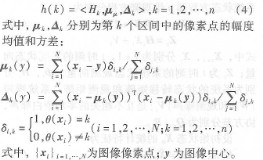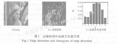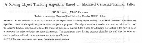 | 一種改進的camshift/kalman運動目標跟蹤算法 劉士榮,姜曉艷 (杭州電子科技大學自動化研究所,浙江杭州310018)     摘    要:針對目標跟蹤中的目標遮擋、丟失等情況,提出了一種改進的基于空間邊緣方向 直方目的camshift/kalman跟蹤算法。首先,利用空間邊緣梯度方向作為匹配信息,同時自適應修正每幀中的匹配模板,再使用kalman濾波器對運動目標的位置進行預測更新,以克服目標遮擋情況及噪聲的干擾。實驗表明,該算法能夠較好處理目標遮擋情況,實現(xiàn)運動目標的高精度跟蹤。 關鍵詞:邊緣方向直方圖;camshift;目標跟蹤 中圖分類號:tp 27    文獻標識碼:a 1引言   運動物體的目標跟蹤是機器視覺研究領域的熱點之一,許多學者已提出多種目標跟蹤算法及其相關的應用。meanshift算法以其無參數(shù),快速匹配的優(yōu)越性被廣泛應用到目標跟蹤領域。它最早由funkunage等人提出并應用到模式識別中;cheng將它引入到計算機視覺領域,并將其應用于目標跟蹤。但是meanshift無法在跟蹤過程中對目標模型進行更新,當目標尺寸變化嚴重時,導致跟蹤不精確,甚至會丟失目標。為了解決此類問題,bradskj[4]提出了camshift算法。這是一種將meanshift算法擴展到連續(xù)圖像序列而得到的運動跟蹤算法,它可以自動調(diào)節(jié)窗口大小以適應目標在圖像中的尺寸變化。它在一定程度上解決了由于運動目標的形變造成的跟蹤不精確問題。文獻[5]中通過自通應擴展搜索窗口解決了因目標加速度而引起的目標瞬間丟失問題。但是由于camshift算法是僅基于色彩信息建立目標直方圖模型進行跟蹤,使得它易受顏色相近的干擾物影響,在目標與背景顏色接近或目標被遮擋時,算法的效果不太理想。     本文基于camshift算法提出了一種改進的camshift/kalman運動目標跟蹤算法。該算法利用邊緣方向直方圖代替顏色直方圖,進一步引入目標模型的空間信息,結合kalman濾波器對運動目標的狀態(tài)進行預測更薪,并且對每幀中的模板采取自適應更新策略。本文所提出的方法具有較強的抗干擾性,且具有較好的精確性和穩(wěn)定性。 2空間邊緣方向直方圖   1)邊緣檢測  圖像邊緣可以看成是由特定方向和幅值的像素點所構成[6]。對灰度圖像g進行邊緣檢測,分別使用sobel算子的兩個模板:     與g進行卷積運算,得到水平和垂直方向的邊緣圖像g,則g中任一像素骱處的梯度幅值和方向分別表示為 式中,gij1∈g1,gij2∈g2分別對應gij∈g,i,j分別為像素對應的行數(shù)和列數(shù);o≤d(gij)≤180度。     2)空間邊緣方向直方圖  為了統(tǒng)計數(shù)據(jù)以便計算直方圖,將d(gij)量化為n等分,n的值可根據(jù)需要選取,取值越大精度越高,計算量也越大。本文取n=8。為達到不受圖像縮放的影響,需要將邊緣方向直方圖歸一化。則邊緣方向直   式中,w,h分別為源圖像的寬、nk為滿足δ≠0且落在第k個角度區(qū)間內(nèi)的像素點個數(shù)。     以lena圖像為例,分別對iena圖像進行邊緣掃描和計算邊緣方向直方圖,所得結果,如圖1所示。   上述方法反映丁二維圖像的數(shù)據(jù)信息。將邊緣為解方向直方圖與空間信息結合,得到空間邊緣方向直方圖[78],而與目標邊緣結構相關,且能夠明顯區(qū)分邊緣不精確問題,效果不太理想,甚至丟失目標。解決以上問題,考慮邊緣方向直方圖不依賴目標的色     用下式來定義兩幅空間邊緣方向直方圖的相似度: |