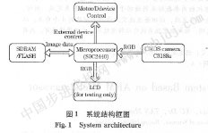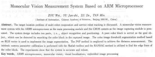 | 基于arm處理器的單目視覺(jué)測(cè)距定位系統(tǒng) 鄒偉,喻俊志,徐德,譚民 (中國(guó)科學(xué)院自動(dòng)化研究所,北京100190)     摘    要:針對(duì)在多機(jī)器人協(xié)作和服務(wù)機(jī)器人目標(biāo)追蹤的過(guò)程中,需要對(duì)目標(biāo)物體或者同伴進(jìn)行準(zhǔn)確的目標(biāo)定位這個(gè)問(wèn)題,設(shè)計(jì)了一個(gè)以arm9微處理器為處理模塊、cmos攝像頭為采集模塊的一個(gè)嵌入式視覺(jué)系統(tǒng),實(shí)現(xiàn)了單目視覺(jué)測(cè)距定位。該系統(tǒng)設(shè)計(jì)大體分為目標(biāo)識(shí)別和定位兩邵分,目標(biāo)標(biāo)識(shí)使用一個(gè)純色的色標(biāo)塊,通過(guò)對(duì)攝像頭采集的圖像中檢測(cè)色標(biāo)塊區(qū)域來(lái)實(shí)現(xiàn)目標(biāo)物體定位;對(duì)色標(biāo)塊的圖像分割采用基于rcb三個(gè)顏色分量的閡值分割算法,單目測(cè)距采用p4p方法,其中,攝像機(jī)的內(nèi)參數(shù)標(biāo)定則借助于matlab工具箱來(lái)完成。同時(shí),采用ransac方法確定色標(biāo)塊的四條邊界直線,以四條直線交點(diǎn)作為色標(biāo)塊的4個(gè)角點(diǎn),從而提高角點(diǎn)檢測(cè)的精度:實(shí)驗(yàn)結(jié)果表明,該測(cè)距定位系統(tǒng)定位精度較高,系統(tǒng)魯棒性好,具有良好的應(yīng)用前號(hào)。 關(guān)鍵詞:arm9處理器;單目視覺(jué);視寬定位;嵌入式圖像處理 中圖分類號(hào):tp 27    文獻(xiàn)標(biāo)識(shí)碼ia 1引  言     視覺(jué)測(cè)量是嵌入式視覺(jué)系統(tǒng)的一個(gè)應(yīng)用方面,視覺(jué)測(cè)量與控制在機(jī)器人領(lǐng)域應(yīng)用廣泛。在視覺(jué)測(cè)量中,由充當(dāng)機(jī)器人眼睛的攝像機(jī)采集到目標(biāo)物體的二維圖像信息,然后送到處理器進(jìn)行處理,以確定物體的位置和方位等信息。根據(jù)視覺(jué)系統(tǒng)使用的攝像機(jī)數(shù)目的不同,視覺(jué)系統(tǒng)可以分為單目、雙目和多目視覺(jué)系統(tǒng)。     單目視覺(jué)系統(tǒng)采用一臺(tái)攝像機(jī)對(duì)目標(biāo)進(jìn)行測(cè)量,本文采用的就是單目視覺(jué)系統(tǒng)。雙目視覺(jué)系統(tǒng)采用兩臺(tái)攝像機(jī)對(duì)目標(biāo)進(jìn)行測(cè)量,多目視覺(jué)系統(tǒng)采用多臺(tái)攝像機(jī)對(duì)目標(biāo)進(jìn)行測(cè)量。     本文在基于arm9的嵌入式平臺(tái)上實(shí)現(xiàn)了單目視覺(jué)測(cè)距功能,通過(guò)在目標(biāo)物體上放置一個(gè)純色的色標(biāo)塊(本文以粉紅色為例),讓攝像機(jī)對(duì)色標(biāo)塊進(jìn)行識(shí)別檢測(cè)定位,以達(dá)到對(duì)目標(biāo)物體進(jìn)行測(cè)距定位的目的。經(jīng)實(shí)驗(yàn)標(biāo)明,該系統(tǒng)測(cè)量精確度高、魯棒性好。 2硬件結(jié)構(gòu)設(shè)計(jì)     本視覺(jué)系統(tǒng)中,用一個(gè)cmos攝像頭作為圖像采集模塊進(jìn)行圖像采集,選用基于arm9的s3 c2440a處理器作為嵌入式處理器運(yùn)行視覺(jué)算法,用sdram和flash作為外部存儲(chǔ)器。   具體硬件構(gòu)成如下:     ①微處理器采用三星公司的s3 c2440,系統(tǒng)可以穩(wěn)定運(yùn)行在主頻405 mhz,主頻****可以達(dá)到530 mhz。     ②64 m字節(jié)的sdram,由兩片k4s561632組成,工作在32位模式下。     ③64 m字節(jié)的naivd flash,采用的是k9 f1208,可以兼容16m,32 m或128 m字節(jié)。     ④攝像頭模塊:cmos攝像頭,內(nèi)核芯片ov7620,30萬(wàn)像素,幀速率30 fps:     ⑤spi接口。     ⑥串行eeprom: at24c02 4kbytes eeprom,iic接口。     其結(jié)構(gòu)框圖,如圖l所示。     其中,cmos攝像頭是通過(guò)26針的接口連接到主板上的,將采集到的24位rgb信號(hào)傳送到存儲(chǔ)設(shè)備中。存儲(chǔ)設(shè)備sdram/flash通過(guò)內(nèi)存控制器將數(shù)據(jù)發(fā)送到微處理進(jìn)行處理,它有8個(gè)內(nèi)存控制器接口。 3算法設(shè)計(jì)     該視覺(jué)系統(tǒng)的設(shè)計(jì)可以分為色標(biāo)塊識(shí)別和攝像機(jī)標(biāo)定測(cè)距兩個(gè)部分。色標(biāo)塊識(shí)別所采用的算法有彩色圖像的閾值分割算法、邊緣提取算法和角點(diǎn)匹配算法,攝像機(jī)標(biāo)定測(cè)距中的內(nèi)參數(shù)標(biāo)定借助于matlab工具箱來(lái)完成,測(cè)距采用pnp方法中的p4p方法,用色標(biāo)塊的4個(gè)角點(diǎn)的已知信息進(jìn)行攝像機(jī)外參數(shù)的標(biāo)定,標(biāo)定完攝像機(jī)外參數(shù),就可以對(duì)目標(biāo)物體進(jìn)行精確定值。     1)色標(biāo)塊識(shí)別算法     ①彩色圖像閾值分割算法直方圖閾值法是灰度圖像廣泛使用的一種分割方法,它基于對(duì)灰度圖像這樣的一種假設(shè):目標(biāo)或背景內(nèi)部的相鄰像素間的灰度值是相似的,但不同目標(biāo)或背景上的像素灰度差異較大,其反映在直方圖上就是不同目標(biāo)或背景對(duì)應(yīng)不同的峰。彩色圖像閾值分割把直方圖閩值分割應(yīng)用到不同的顏色空間,甚至可以直接應(yīng)用于每個(gè)顏色分量上,其結(jié)果再   |