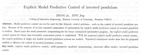 | 倒立擺系統(tǒng)顯式模型預(yù)測控制 張聚,丁靖 浙江丁業(yè)大學(xué)信息工程學(xué)院,浙江杭州310032     摘    要:由于模型預(yù)測控制的反復(fù)在線優(yōu)化計算特點,使得模型預(yù)測控制難以適用于動態(tài)變化較快的機電系統(tǒng)的控制,如倒立擺動系統(tǒng)的控制,為此研究了倒立擺動系統(tǒng)的顯式模型預(yù)測控制;诩s束線性優(yōu)化控制問題的多參數(shù)規(guī)劃方法,建立了顯式模型預(yù)測控制系統(tǒng),以避免控制系統(tǒng)反復(fù)在線優(yōu)化計算。應(yīng)用建立的顯式模型預(yù)測控制系統(tǒng),對于直線一級和二級倒立擺系統(tǒng)控制做了研究,并做了數(shù)值仿真計算研究結(jié)果表明倒立擺系統(tǒng)顯式模型預(yù)測控制的平衡控制效果是明顯的. 關(guān)鍵詞:顯式模型預(yù)測控制;多參數(shù)二次規(guī)劃;pwa模型;倒立擺系統(tǒng) 中圖分類號:tp 27    文獻標(biāo)識碼:a 1、引言     棋型預(yù)測控制技術(shù)是一種處理多變量約束系統(tǒng)****控制問題的最有效方法之一,已經(jīng)在石油、化工等流程工業(yè)領(lǐng)域獲得了廣泛應(yīng)用,取得了巨大的經(jīng)濟效益與社會效益(如減少能耗,減少污染):由于模型預(yù)測控制的反復(fù)在線優(yōu)化計算特點,使得模型預(yù)測控制通常只能適用于被控對象規(guī)模不是很大或者系統(tǒng)的動態(tài)變化較慢的場合,難以適用于采樣速率較高的系統(tǒng),如動態(tài)變化較快的機電系統(tǒng)。     近幾年,國際上對于優(yōu)化控制問題的顯式求解方面的研究非常重視,最有影響的是bemporad等人所做的開創(chuàng)性工作.文獻把多參數(shù)規(guī)劃理論引入到線性時不變對象的約束二次優(yōu)化控制問題的求解中,得到了優(yōu)化控制問題****控制律與優(yōu)化問題所含的參數(shù)之間的顯式函數(shù)關(guān)系。之后的許多學(xué)者對于多參數(shù)規(guī)劃問題的求解方法的效率做了進一步的改進。   本文基于約束線性優(yōu)化控制問題的多參數(shù)規(guī)劃求解方法,建立了約束線性系統(tǒng)的顯式模型預(yù)測控制系統(tǒng):應(yīng)用建立的顯式模型預(yù)測控制系統(tǒng),對于倒立擺系統(tǒng)的顯式模型預(yù)測控制做了研究,并做數(shù)值仿真計算。 2約束線性對象的顯式模型預(yù)測控制     考慮約束線性離敬系統(tǒng)的****控制問題:     定義x∈r為滿足(1)式中約束條件x(0)的集合,優(yōu)化問題(1),為****決策向量取決于x(0),即當(dāng)x(0)的值改變時也隨之改變。通常,當(dāng)x(0)的值改變時,都是重新求解優(yōu)化問題(1)。如果把系統(tǒng)的狀態(tài)x(0)看作優(yōu)化問題(1)的參數(shù)向量,設(shè)法得到當(dāng)x(0)在可能的區(qū)域內(nèi)改變時,那么就可以避免x(0)取值變化時的反復(fù)優(yōu)化計算。把系統(tǒng)的狀態(tài)x(0)看作優(yōu)化問題(1)的參數(shù)向量,把優(yōu)化問題(1)視為多參數(shù)二次規(guī)劃問題,通過多參數(shù)二次規(guī)劃問題的求解方法,得到優(yōu)化問題(1)的顯式解。     結(jié)論1約束線性時不變系統(tǒng)的****控制問題(1)及對應(yīng)的多參數(shù)二次規(guī)劃問題,其可行域z為多面體域。****決策向量w(x(o))是x(0)的分段線性連續(xù)函數(shù) cr為多面體集。     根據(jù)模型預(yù)測控制算法的滑動時域優(yōu)化策略,每~時刻實際作用到被控對象的控制信號為****決策向量中的第一個控制信號。     由結(jié)論1可知,按照滑動時域控制策略,對應(yīng)任意時刻t和狀態(tài)x(t),實際作用到系統(tǒng)上的控制量u(t)為     f,g,h,k由求解多參數(shù)二次規(guī)劃問題得到。由式(2)可以得到與隱式閉環(huán)模型預(yù)測控制系統(tǒng)等價的顯式模型預(yù)測控制系統(tǒng),即閉環(huán)系統(tǒng)實質(zhì)上已經(jīng)轉(zhuǎn)化為分段仿射系統(tǒng)(3)。     顯式模型預(yù)測控制由于無需做反復(fù)的在線優(yōu)化計算,在線計算時間大為減少,因此顯式模型預(yù)測控制能夠適用于采樣速率高和問題規(guī)模大的系統(tǒng),擴展了模型預(yù)測控制技術(shù)的適用范圍[3-4]。顯式模型預(yù)測控制對應(yīng)每個狀態(tài)分區(qū)上的控制律是簡單的線性關(guān)系,因而抑制律的實現(xiàn)簡單、穩(wěn)定和可靠。工程實際中,顯式模型預(yù)測控制系統(tǒng)可用微控制器或者嵌入式控制系統(tǒng)來實現(xiàn)。 3倒立擺系統(tǒng)顯式模型預(yù)測控制 |