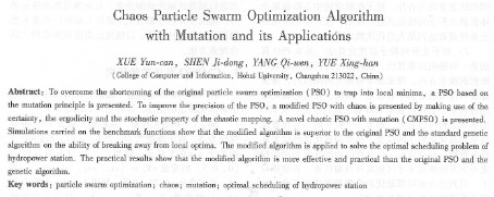 | 混沌變異粒子群優(yōu)化算法及其應(yīng)用研究 薛云燦,沈繼東,楊啟文,岳興漢 河海大學(xué)計(jì)算機(jī)與信息學(xué)院,江蘇常州213022     摘    要:為克服粒子群優(yōu)化算法容易陷入局部****值的缺點(diǎn),提出了基于變異思想的粒 子群優(yōu)化算法,為提高粒子群優(yōu)化算法的計(jì)算精度,利用混沌運(yùn)動隨機(jī)性、遍歷性的特點(diǎn),提出了一種基于混沌思想的改進(jìn)粒子群優(yōu)化算法,進(jìn)而提出了基于混沌變異的改進(jìn)粒子群優(yōu)化算法( cmpso);趲追N典型benchmark函數(shù)的測試研究結(jié)果表明,該算法與基本pso算法和遺傳算法相比,較好地克服了早熟收斂,提高了算法的搜索精度。將該算法應(yīng)用于水庫化調(diào)度問題中,所得結(jié)果優(yōu)于標(biāo)準(zhǔn)粒子群優(yōu)化算法和遺傳算法,這也驗(yàn)證了混沌變異粒子群優(yōu)化算法的有效性。 關(guān)鍵詞:粒子群優(yōu)化;混沌;變異;水庫優(yōu)化調(diào)度 中圖分類號:tp 27    文獻(xiàn)標(biāo)識碼:a 1引言     粒子群優(yōu)化(pso)算法最早是由kennedy和eberhart于1995年提出的一種群體智能優(yōu)化算法。由于認(rèn)識到pso所蘊(yùn)含的廣闊應(yīng)用前景,許多學(xué)者都進(jìn)行了這方面的研究,目前,pso已廣泛應(yīng)用于函數(shù)優(yōu)化、神經(jīng)網(wǎng)絡(luò)訓(xùn)練、tsp求解、鋼鐵生產(chǎn)計(jì)劃與調(diào)度等領(lǐng)域。   但pso電存在著精度較低,易早熟等缺點(diǎn),為解決這些問題,研究者提出了多種改進(jìn)算法,如壓縮因子法、社會趨同法、保收斂pso等。   然而,到目前為止,粒子群優(yōu)化算法的上述缺點(diǎn)并沒有得到根本解決,成功應(yīng)用粒子群算法解決實(shí)際問題的研究也很少。為解決這些問題,本文將變異和混沌思想引入粒子群優(yōu)化算法,構(gòu)建了混沌變異粒子群優(yōu)化( cmpso)算法,利用變異特性來克服標(biāo)準(zhǔn)粒子群優(yōu)化算法容易陷入局部****點(diǎn)的缺點(diǎn),利用混沌的特性來提高算法的計(jì)算精度。     水庫優(yōu)化調(diào)度問題具有非線性、強(qiáng)約束等特點(diǎn),求解起來比較困難。為驗(yàn)證所提算法的有效性,該算法被應(yīng)用于水庫優(yōu)化調(diào)度問題求解。 2混沌變異粒子群優(yōu)化算法     1)基本粒子群優(yōu)化算法粒子群優(yōu)化算法的本質(zhì)是通過粒子對自身經(jīng)驗(yàn)的總結(jié)和粒子之間的信息交流,從而不斷修正粒子的運(yùn)動狀態(tài),并且逐漸的將粒子吸引到****區(qū)域。粒子群優(yōu)化算法的粒子一般采用位置一速度模型第i個(gè)粒子的位置變量表示為xi,速度交量表示為vi,d為維數(shù)。解空間中的每個(gè)粒子代表一組可行解,解的優(yōu)劣程度由對目標(biāo)函數(shù)的適應(yīng)程度決定。   在迭代過程中,粒子根據(jù)粒子在運(yùn)動過程中產(chǎn)生的****位置pi(稱為個(gè)體極值點(diǎn))和整個(gè)種群所經(jīng)歷的****位置pg(稱為全局極值點(diǎn))來更新速度和位置:     從速度更新公式中可知,速度更新由三部分組成。第一部分表示粒子維持原速度的程度;第二部分是自我認(rèn)知部分,表示粒子對自身成功經(jīng)驗(yàn)的肯定;第三部分是社會部分,代表粒子間的信息交流與合作。粒子在解空間中不斷跟蹤個(gè)體極值點(diǎn)和全局極值點(diǎn)進(jìn)行搜索,直到果滿足終止條件或者達(dá)到****迭代次數(shù)為止。     2)基于變異的粒子群優(yōu)化算法基本pso算法是一種隨機(jī)搜索算法,在搜索過程開始以后就不能控制搜索方向,搜索結(jié)果有很大的隨機(jī)性,搜索速度和搜索精度都不夠穩(wěn)定。因此,在實(shí)際優(yōu)化應(yīng)用過程中,必須對基本pso算法進(jìn)行改進(jìn)。從pso的基本方程可以看出,如果一個(gè)粒子的當(dāng)前位置接近全局****化粒子的位置,而全局****值的位置還沒有獲得,那么該粒子只有在以前的速度和初始權(quán)重不為零的情況下才可能離開當(dāng)前位置:否則該粒子一旦到達(dá)當(dāng)前局部****的位置都將停止移動,這就是所謂算法的“早熟收斂”。     為了防止出現(xiàn)早熟現(xiàn)象,需要在搜索過程中及時(shí)改變搜索方向,使粒子盡快離開沒有價(jià)值的搜索區(qū)域,尤其是在搜索陷于某個(gè)局部極值點(diǎn)的時(shí)候。改進(jìn)方法的基本思想是在基本pso搜索過程中令部分粒子反方向運(yùn)動,使這些粒子朝局部極值的相反方向運(yùn)動,以保證種群的多樣性,即:     從而兼顧優(yōu)化過程的精度和效率。     3)基于混沌搜索的粒子群優(yōu)化算法一般將由確定性方程得到的具有隨機(jī)性的運(yùn)動狀態(tài)稱為混沌運(yùn)動;   |