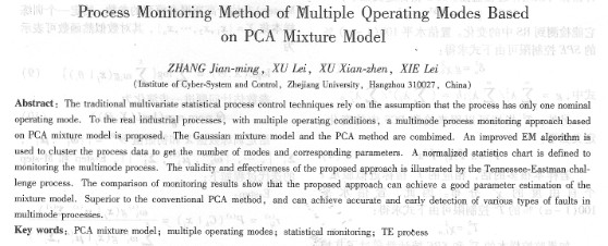 | 基于混合pca模型的多工況過程監(jiān)控方法   張建明,徐磊,許仙珍,謝磊 (浙江大學(xué)智能系統(tǒng)與控制研究所,浙江杭州310027)     摘    要:傳統(tǒng)的多變量統(tǒng)計(jì)過程監(jiān)控方法一般都假設(shè)過程只運(yùn)行在一個(gè)穩(wěn)定工況下,但很多實(shí)際工業(yè)過程往往具有多工況特征。針對(duì)這一問題,提出一種基于混合pca模型的多工況過程監(jiān)控方法:將混合高斯模型和pca相結(jié)合,用改進(jìn)的em算法估計(jì)模型的工況數(shù)以及各工況的分布參數(shù)和主元數(shù),并構(gòu)建歸一化的統(tǒng)計(jì)量實(shí)現(xiàn)對(duì)多工況過程的監(jiān)控。te過程的仿真研究表明,所提出的方法相對(duì)傳統(tǒng)pca方法能更精確地估計(jì)各工況的統(tǒng)計(jì)特性,從而更準(zhǔn)確及時(shí)地檢測(cè)出多工況過程的各種故障。 關(guān)鍵詞:混合pca模型;多工況;統(tǒng)計(jì)監(jiān)控;te過程 中圖分類號(hào):tp 27    文獻(xiàn)標(biāo)識(shí)碼:a 1引言     傳統(tǒng)的多變量統(tǒng)計(jì)過程監(jiān)控(mspc)方法已被廣泛研究并應(yīng)用于很多工業(yè)過程。這類方法一般都假設(shè)正常的過程數(shù)據(jù)來自單個(gè)工況,而在實(shí)際工業(yè)過程中,工況會(huì)因?yàn)楹芏嘁蛩兀ㄈ缭、產(chǎn)品特性等)而改變。在這種情況下,傳統(tǒng)的mspc方法便不再適用。   近年來,很多學(xué)者引入了新的建模方法來處理多工況過程監(jiān)控問題。文獻(xiàn)[1]提出了一種結(jié)合pca和貝葉斯分類的方法,其不足在于要求各工況數(shù)據(jù)必須具有相同的線性冗余結(jié)構(gòu),否則數(shù)據(jù)的協(xié)方差會(huì)出現(xiàn)奇異,導(dǎo)致無法建模。文獻(xiàn)[2]提出了一種多pca/pls模型,但在初始階段需要有先驗(yàn)知識(shí)把歷史數(shù)據(jù)人為地分到與各工況對(duì)應(yīng)的集合里去。文獻(xiàn)[3]提出了一種基于貝葉斯推理的有限高斯混合模型,其缺點(diǎn)是計(jì)算量大,且對(duì)于線性相關(guān)的過程數(shù)據(jù)而言,數(shù)據(jù)協(xié)方差會(huì)出現(xiàn)奇異。   本文針對(duì)以上方法的不足,引入了混合pca模型來監(jiān)控多工況過程。用改進(jìn)的em算法來訓(xùn)練該模型,估計(jì)出的工況數(shù)以及各工況的主元數(shù)、均值、協(xié)方差和先驗(yàn)概率能夠很好地描述正常過程數(shù)據(jù)。然后用歸一化的統(tǒng)計(jì)量實(shí)現(xiàn)對(duì)多工況過程的監(jiān)控。 2傳統(tǒng)的pca監(jiān)控方法   pca是最基本的mspc方法,已成動(dòng)用來監(jiān)控大量的化工過程”。它的應(yīng)用是基于這一假設(shè):過程在正常運(yùn)行狀態(tài)下,其統(tǒng)計(jì)特性不會(huì)發(fā)生太大的改變,或者說過程數(shù)據(jù)近似服從多元高斯分布。傳統(tǒng)的pca監(jiān)控方法利用正常數(shù)據(jù)建立單一主元模型,然后用該模型對(duì)新的采集樣本進(jìn)行spe統(tǒng)計(jì)量和嚴(yán)統(tǒng)計(jì)量的假設(shè)檢驗(yàn)。     假設(shè)x屬于r表示一個(gè)m維樣本向量,x屬于r是有n個(gè)樣本的規(guī)范化數(shù)據(jù)矩陣。載荷矩陣p可以由協(xié)方差矩陣cov (x)的特征值分解求得:     假設(shè)前2個(gè)主分量保留在pcs之中,那么spe和嚴(yán)這兩個(gè)統(tǒng)計(jì)指標(biāo)可以用作過程監(jiān)控。spe指標(biāo)定義如下: 它能檢測(cè)到rs中的變化。置信水平百分之(100(l-α))的spe控制限可由下式求得:     另外,嚴(yán)指標(biāo)可以用來檢測(cè)pcs中的變化,定義如下:   若樣本很多的話,相應(yīng)的嚴(yán)指標(biāo)近似服從χ2個(gè)自由度的分布。因此,置信水平百分之(100(l-α))的嚴(yán)控制限可由下式求得:     如果監(jiān)控樣本的嚴(yán)和spe統(tǒng)計(jì)量超過了其控制限,則可以判定過程在置信度為(1-α)的條件下出現(xiàn)了故障。 3  基于混合pca模型的監(jiān)控方法     1)高斯混合模型對(duì)于多工況過程而言,多元高斯分布的假設(shè)無效。但是在某一單獨(dú)工況下,數(shù)據(jù)子集仍服從高斯分布。因此,可以用高斯混合模型來表示多工況下的過程數(shù)據(jù)。在該混合模型中,每一個(gè)高斯分量對(duì)應(yīng)一個(gè)獨(dú)立的工況,分量數(shù)等于所有正常工況的   |