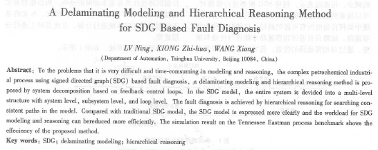 摘 要:針對采用符號有向圖( signed directedgraph,sdg)對石化工業(yè)系統(tǒng)進(jìn)行故障診斷時,經(jīng)常存在sdc建模和推理過程十分繁瑣、困難的問題,提出了一種基于控制回珞分解系統(tǒng)的sdg分層建模及遞階推理方法。在建立sdg模型時將整個系統(tǒng)分解為含有系統(tǒng)層、子系統(tǒng)層和回路層的多層次模型架構(gòu),進(jìn)而利用遞階推理在分層sdg模型中搜索相容通路來實(shí)現(xiàn)故障診斷。該方法能清晰表述工業(yè)系統(tǒng)的sdg模型,減少了建模和推理的復(fù)雜度。以tennes-seeeastman仿真系統(tǒng)為倒進(jìn)行了驗(yàn)證,證明了方法的有效性。