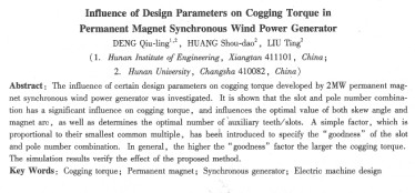 本文研究了2 mw永磁同步發(fā)電機(jī)某些設(shè)計(jì)參數(shù)對齒槽轉(zhuǎn)矩的影響。特別是齒槽配合對齒槽轉(zhuǎn)矩的影響,也考慮了齒槽配合與某些設(shè)計(jì)參數(shù)之間的關(guān)系,如齒槽配合與極弧、斜槽、輔助齒槽等設(shè)計(jì)參數(shù)之間的關(guān)系。