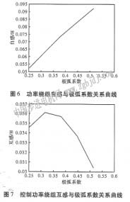 為了計(jì)算分析電感參數(shù)與極弧系數(shù)的關(guān)系曲線,選取不同的極弧系數(shù)分別進(jìn)行電磁場計(jì)算。功率繞組的自感、互感及控制繞組與功率繞組之間的互感與極弧系數(shù)的關(guān)系曲線分別如圖6、圖7所示: