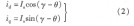 式中,y=ws+γ0,ws為電角速度,γ0為初相角。式中三相電流如果轉(zhuǎn)換成用d-q軸上的電流來表示,假定把時(shí)間軸與三相繞組軸線a、b、c重合,與d軸的夾角為,則d-q軸上的電流分別為: