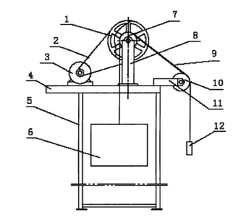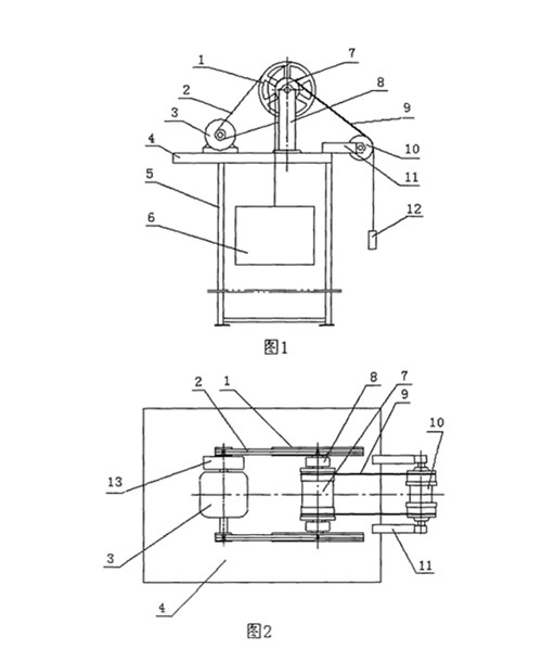 實(shí)施例1:參閱圖1。本實(shí)用新型開關(guān)磁阻電機(jī)驅(qū)動(dòng)的直接平衡抽油機(jī),支撐架5高度1 2米。支撐架5頂部固定有工作平臺(tái)4,工作平臺(tái)4長度2.5米,寬度1.5米。在工作平臺(tái)4上固定有開關(guān)磁阻電機(jī)3,控制柜由導(dǎo)線連接開關(guān)磁阻電機(jī)3。開關(guān)磁阻電機(jī)3有兩端輸出軸,開關(guān)磁阻電機(jī)3的一端動(dòng)力輸出軸上連接有電磁制動(dòng)器1 3,兩端輸出軸上分別固定有皮帶傳動(dòng)裝置。皮帶傳動(dòng)裝置包括兩個(gè)皮帶輪1和皮帶2。在工作平臺(tái)4的頂部固定有軸承架8,軸承架8上有主軸,主軸上連接并支撐有皮帶輪1和摩擦滾筒7。摩擦滾筒7的外壁上固定有15毫米厚的襯墊14,襯墊14的作用是增加與鋼絲繩9摩擦力。在工作平臺(tái)4的邊沿固定有支座11,支座11上固定有導(dǎo)向滾筒10。在摩擦滾筒7和導(dǎo)向滾筒10上有兩根鋼絲繩9繞過。鋼絲繩9一端連接平衡塊6,另一端連接懸繩器1 2。平衡塊6垂直懸掛在支撐架5內(nèi)框中。 平衡塊6的兩側(cè)有導(dǎo)向輪,采用兩面導(dǎo)向。平衡塊6包括分為固定平衡塊和可添加平衡塊?商砑悠胶鈮K的結(jié)構(gòu)采用鋼板焊接的箱體,在箱體內(nèi)有鐵砂或重晶石粉。 本開關(guān)磁阻電機(jī)驅(qū)動(dòng)的直接平衡抽油機(jī)的沖程可根據(jù)需要做無級(jí)調(diào)節(jié)。這是因?yàn)閾Q向位置是由無觸點(diǎn)開關(guān)位置決定的,換向位置任意調(diào)整。 沖次的調(diào)節(jié)是依靠開關(guān)磁阻電機(jī)可以在0—150rpm之間,通過控制柜按鈕任意調(diào)整。