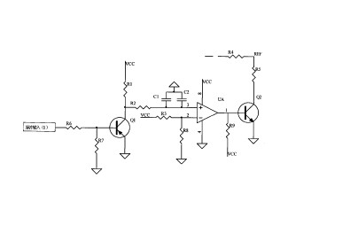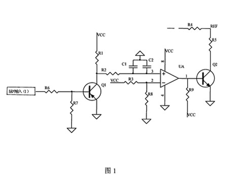 本實用新型的上述技術(shù)問題主要是通過下述技術(shù)方案得以解決的:本實用新型的脈沖輸入接三極管Q1的基極,Q1的集電極接比較器UA的正向輸入腳,比較器UA的輸出腳接三極管Q2的基極,Q2的集電極接電阻R5,電阻R5再接主控芯片的REF腳,Q1、Q2的發(fā)射極均接地。有脈沖輸入時,三極管Q1處于半導(dǎo)通狀態(tài),比較器UA輸出低電平,使三極管Q2不導(dǎo)通,加在主控芯片REF腳的電壓為U;切斷脈沖輸入時,Q1不導(dǎo)通,比較器UA輸出高電平,使Q2導(dǎo)通,通過電阻R5分壓使加在主控芯片的REF腳的電壓變?yōu)閁/2,驅(qū)動器的輸出電流也變?yōu)樵瓉淼囊话耄瑢崿F(xiàn)步進電機驅(qū)動器的自動半流,使電機的發(fā)熱量減小,噪聲也降低。 作為優(yōu)選,所述的脈沖輸入經(jīng)電阻R6接所述的三極管Q1的基極,Q1的基極又經(jīng)電阻R7接地,Ql的集電極經(jīng)電阻R1接電壓’VCC,同時Ql的集電極經(jīng)電阻R2接所述的比較器UA的正向輸入腳,UA的正向輸入腳與地之間還連接有電容C1、C2的并聯(lián)電路,比較器UA的負(fù)向輸入腳經(jīng)電阻R3接電壓VCC、經(jīng)電阻R8接地,比較器UA的輸出腳經(jīng)電阻R9接電壓VCC。使驅(qū)動器電路更加完善。 本實用新型的有益效果是:通過在切斷脈沖輸入時使加在主控芯片的REF、腳上的電壓降為正常工作時的一半,使驅(qū)動器的輸出電流也變?yōu)樵瓉淼囊话,實現(xiàn)自動半流,使電機的發(fā)熱量減小,噪聲也降低,確保電機性能,延長電機使用壽命。 附圖說明圖1是本實用新型的一種電路原理圖。 具體實施方式下面通過實施例,并結(jié)合附圖,對本實用新型的技術(shù)方案作進一步具體的說明。 實施例1:本實施例的自動半流的步進電機驅(qū)動器,如圖1所示,脈沖輸入1經(jīng)電阻R6接三極管Q1的基極,Q1的基極又經(jīng)電阻R7接地,Q1的集電極經(jīng)電阻Rl接電壓VCC,同時Q1的集電極經(jīng)電阻R2接比較器UA的正向輸入腳,UA的正向輸入腳與地之間還連接有電容C1、C2的并聯(lián)電路,比較器UA的負(fù)向輸入腳經(jīng)電阻R3接電壓VCC、經(jīng)電阻R8接地,比較器UA的輸出腳接三極管Q2的基極,同時Q2的基極經(jīng)電阻R9接電壓VCC,Q2的集電極接電阻R5,電阻R5再接主控芯片的REF腳,Q1、Q2的發(fā)射極均接地。 工作過程:有脈沖輸入時,三極管Q1處于半導(dǎo)通狀態(tài),比較器UA輸出低電平,使三極管Q2不導(dǎo)通,加在主控芯片REF腳的電壓為U;切斷脈沖輸入時,4 說明書第3/3頁Q1不導(dǎo)通,Q1的集電極為高電平,則比較器UA輸出高電平,使Q2導(dǎo)通,通過電阻R5分壓使加在主控芯片的REF腳的電壓變?yōu)閁/2,驅(qū)動器的輸出電流也變?yōu)樵瓉淼囊话耄瑢崿F(xiàn)步進電機驅(qū)動器的自動半流,使電機的發(fā)熱量減小,噪聲也降低,確保電機性能,延長電機使用壽命。
