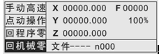 在手動操作界面下,按左側對應按鍵F4進入“回機械零”,此時“回機械零”按鍵顏色反顯,保持“回機械零”狀態(tài),其回機械零(參考點)的“回零高速”“回零低/高速”速度參數在“參數設置”中的“速度參數”區(qū)設置,為固定模式(倍率按鈕有效)。