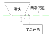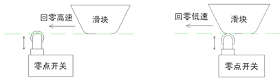 2).碰到零點開關后,速度迅速降低至“回零低速”運行,直至經過開關且開關由閉合變?yōu)殚_啟
