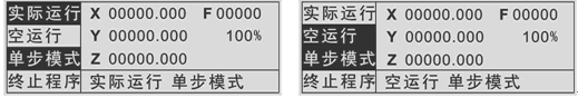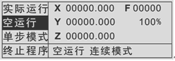 此時(shí)控制器“空運(yùn)行”按鍵顏色為反顯,系統(tǒng)進(jìn)入連續(xù)運(yùn)動(dòng)模式下的空運(yùn)行狀態(tài)