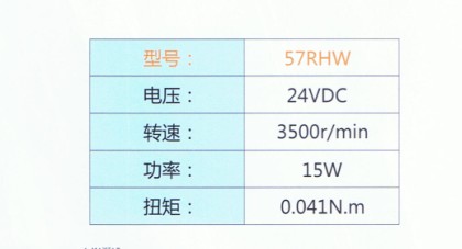 型號:57RHW-02 額定電壓:24VDC, 額定功率:40W, 輸出轉(zhuǎn)速:4000轉(zhuǎn)/分, 轉(zhuǎn)向:正反雙向, 轉(zhuǎn)速:200-4000轉(zhuǎn)可以無級調(diào)速 噪音:小于45分貝 壽命:大于30000小時 電機配控制器