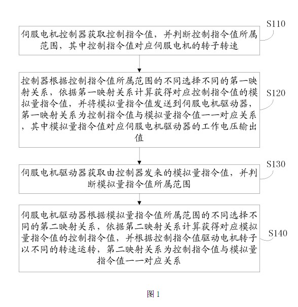 提供一種伺服電機  控制方法,包括如下步驟:伺服電機控制器獲取控制指令值,并判斷控制指令值所屬范圍,  其中控制指令值對應(yīng)伺服電機的轉(zhuǎn)子轉(zhuǎn)速;控制器根據(jù)控制指令值所屬范圍的不同選擇不  同的第一映射關(guān)系, 依據(jù)第一映射關(guān)系計算獲得對應(yīng)控制指令值的模擬量指令值,并將模  擬量指令值發(fā)送到伺服電機驅(qū)動器,第一映射關(guān)系為控制指令值與模擬量指令值一一對應(yīng)
