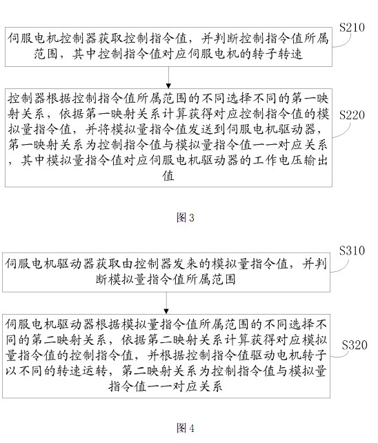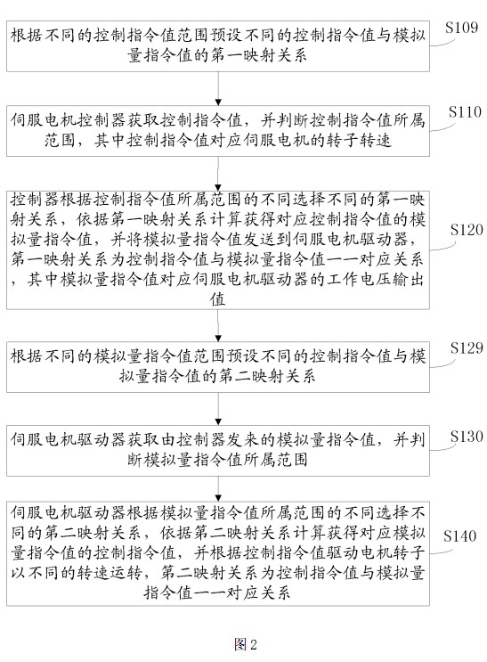 所述伺服電機驅(qū)動器獲取由所述控制器發(fā)來的模擬量指令值,并判斷所述模擬量指令  值所屬范圍;  所述伺服電機驅(qū)動器根據(jù)所述模擬量指令值所屬范圍的不同選擇不同的第二映射關(guān)  系,依據(jù)所述第二映射關(guān)系計算獲得對應(yīng)模擬量指令值的控制指令值,并根據(jù)所述控制指  令值驅(qū)動電機轉(zhuǎn)子以不同的轉(zhuǎn)速運轉(zhuǎn),所述第二映射關(guān)系為控制指令值與模擬量指令值  一一對應(yīng)關(guān)系。  6. 根據(jù)權(quán)利要求5 所述的伺服電機控制方法,其特征在于,在所述伺服電機驅(qū)動器根  據(jù)模擬量指令值所屬范圍的不同選擇不同的第二映射關(guān)系, 通過計算獲得對應(yīng)的控制指令 值的步驟之中,所述驅(qū)動器獲得的模擬量指令值的****值越小,所述驅(qū)動器對應(yīng)輸出的所  述控制指令值與模擬量指令值的比值越小。  7. 根據(jù)權(quán)利要求6 所述的伺服電機控制方法,其特征在于,在所述伺服電機驅(qū)動器獲  取由所述控制器發(fā)來的模擬量指令值的步驟之前,包括: 根據(jù)不同的模擬量指令值范圍預(yù)設(shè)不同的控制指令值與模擬量指令值的第二映射關(guān)系。