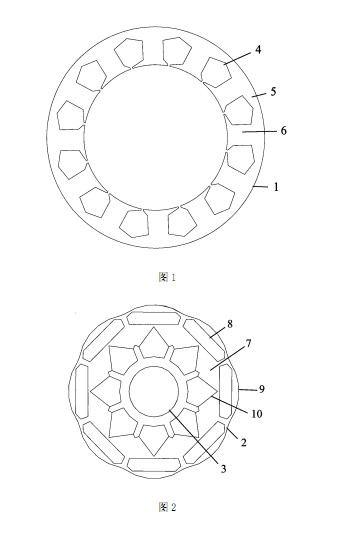 [0015]  以上圖中有:定子1、轉(zhuǎn)子2、轉(zhuǎn)軸3、定子槽4、定子鐵心5、定子齒6、轉(zhuǎn)子鐵心7、 磁鋼8、轉(zhuǎn)子外圓弧9、五邊形孔10。  具體實(shí)施方式 [0016]  下面結(jié)合附圖與具體實(shí)施方式對本實(shí)用新型做進(jìn)一步的說明: